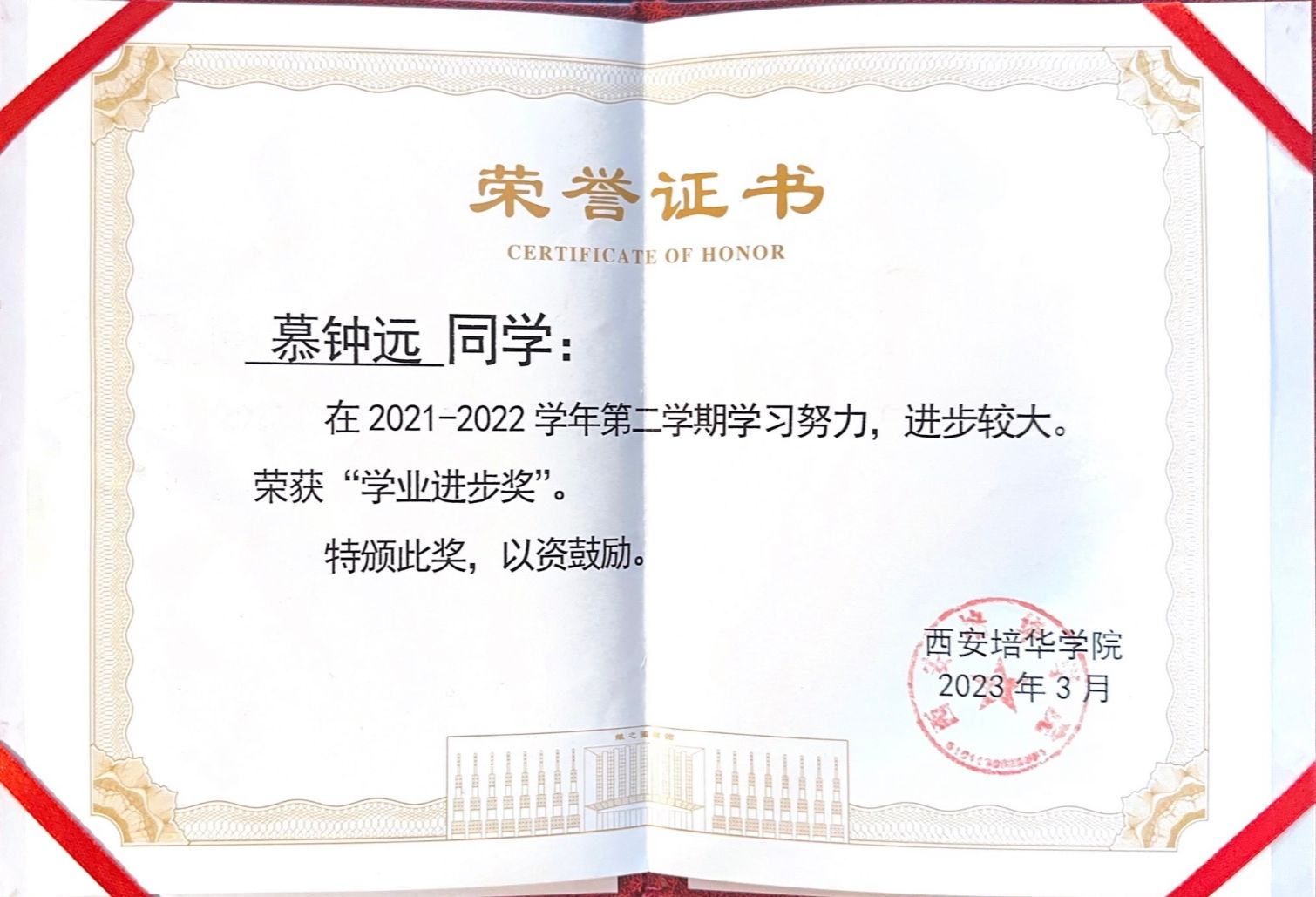 9.2023年3月获得西安培华学院学业进步奖