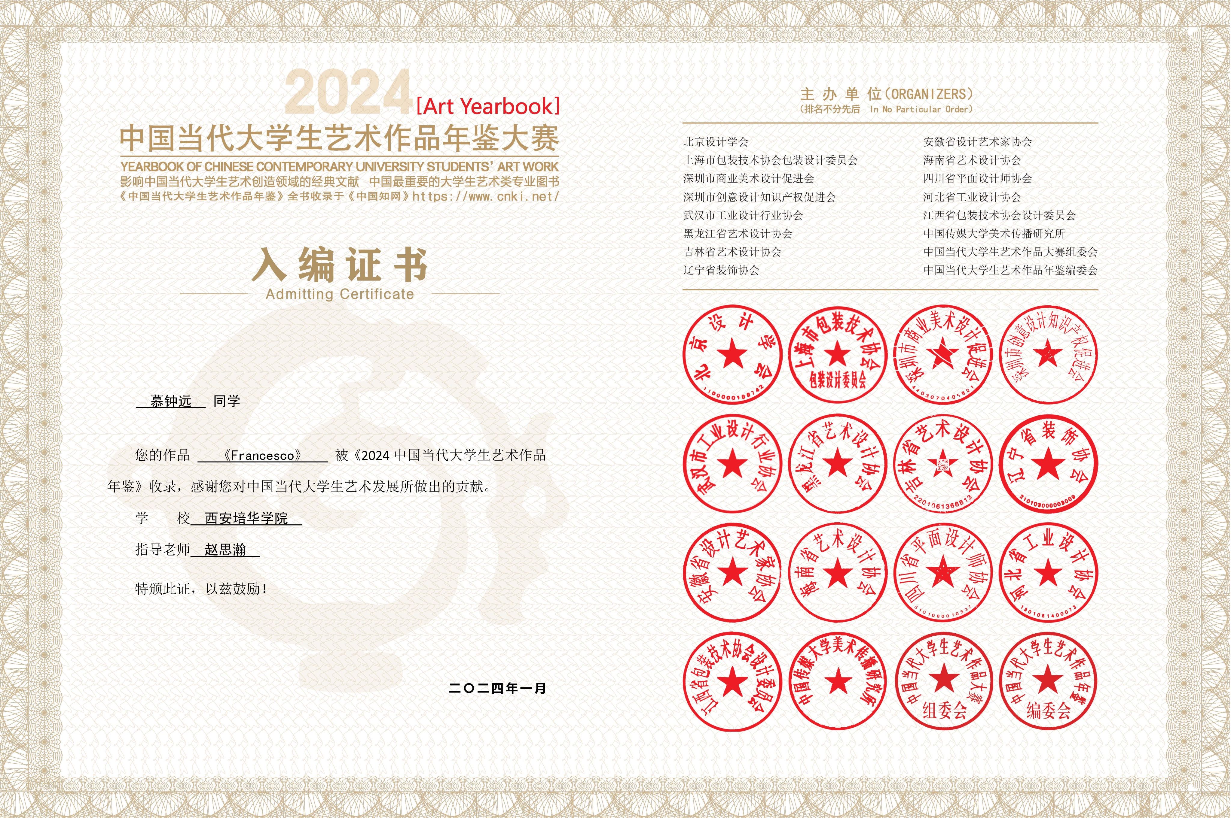 2.2024年1月作品《Francesco》被中国当代大学生艺术年鉴收录;