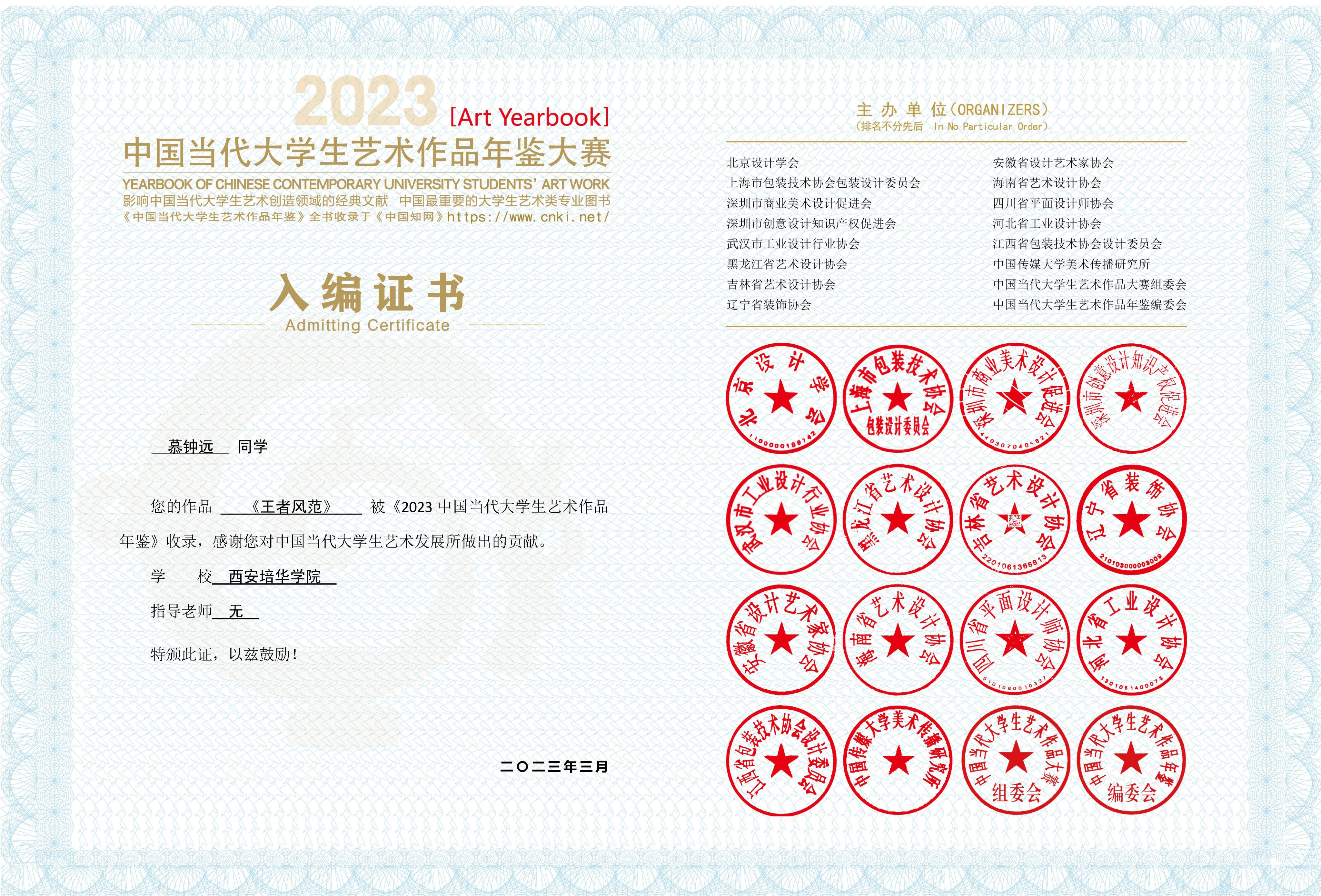 10.2023年3月作品《最“可爱”的人》、《蓝色印记》、《王者风范》被中国当代大学生艺术年鉴收录;