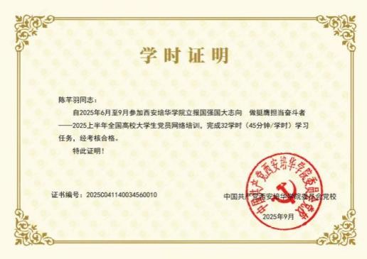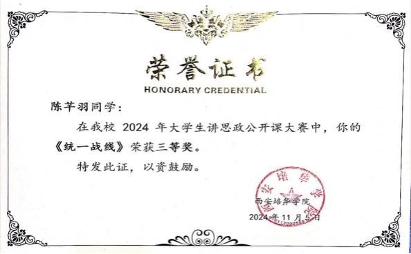 大学是人生成长的关键时期,陈芊羽同学始终以高标准锤炼思想、精进自我,尤为重视自身思想的成熟与提升。她深耕理论学习,2024年加入学院“红心向党”宣讲团,累计开展七期主题宣讲活动,以实践传播正能量。2025年6月,她正式成为中共党员,始终以正确的思想理念武装头脑、提升思想政治觉悟,真正做到内化于心、外化于行。凭借扎实的理论功底与实践积累,她先后荣获“大学生讲思政课”三等奖、“我心中的思政课”微电影三等奖。