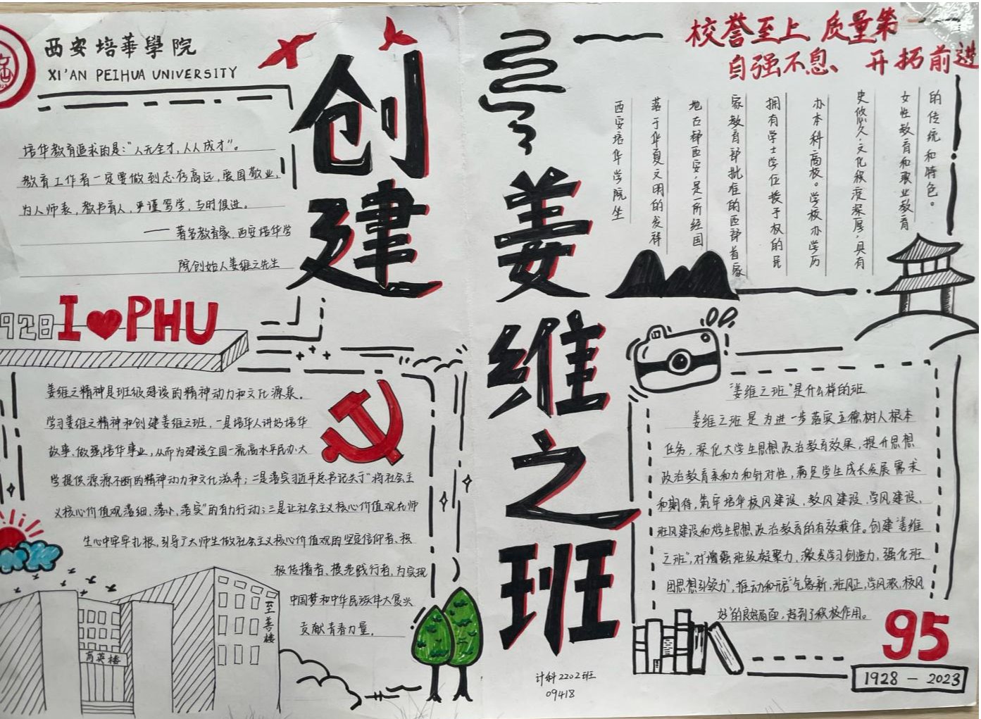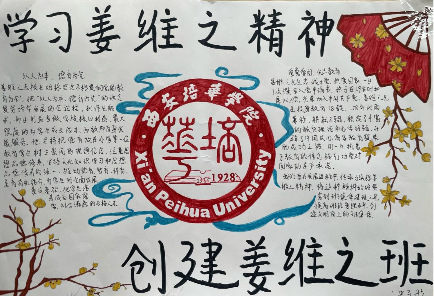 姜维之老校长一生忠于教育事业,严格践行“以人为本、以德为先”的办学理念,注重教育教学质量和学生综合素质,办人民满意的大学,赢得了政府和社会各界的一致好评。是当代中国民办高等教育的开拓者,为陕西乃至全国民办高教事业的发展做出了杰出贡献。“姜维之班”的创建,是一种精神的传承,是我们每一位培华师生的力量源泉。不同的手抄报从各个维度、各个层面很好的诠释了姜维之精神的内涵,充分展示了智信青年对创建“姜维之班”的热情和积极性,具有很强的学习意义和宣传价值。也为我们深入了解维之精神、践行维之精神提供了更好的渠道。