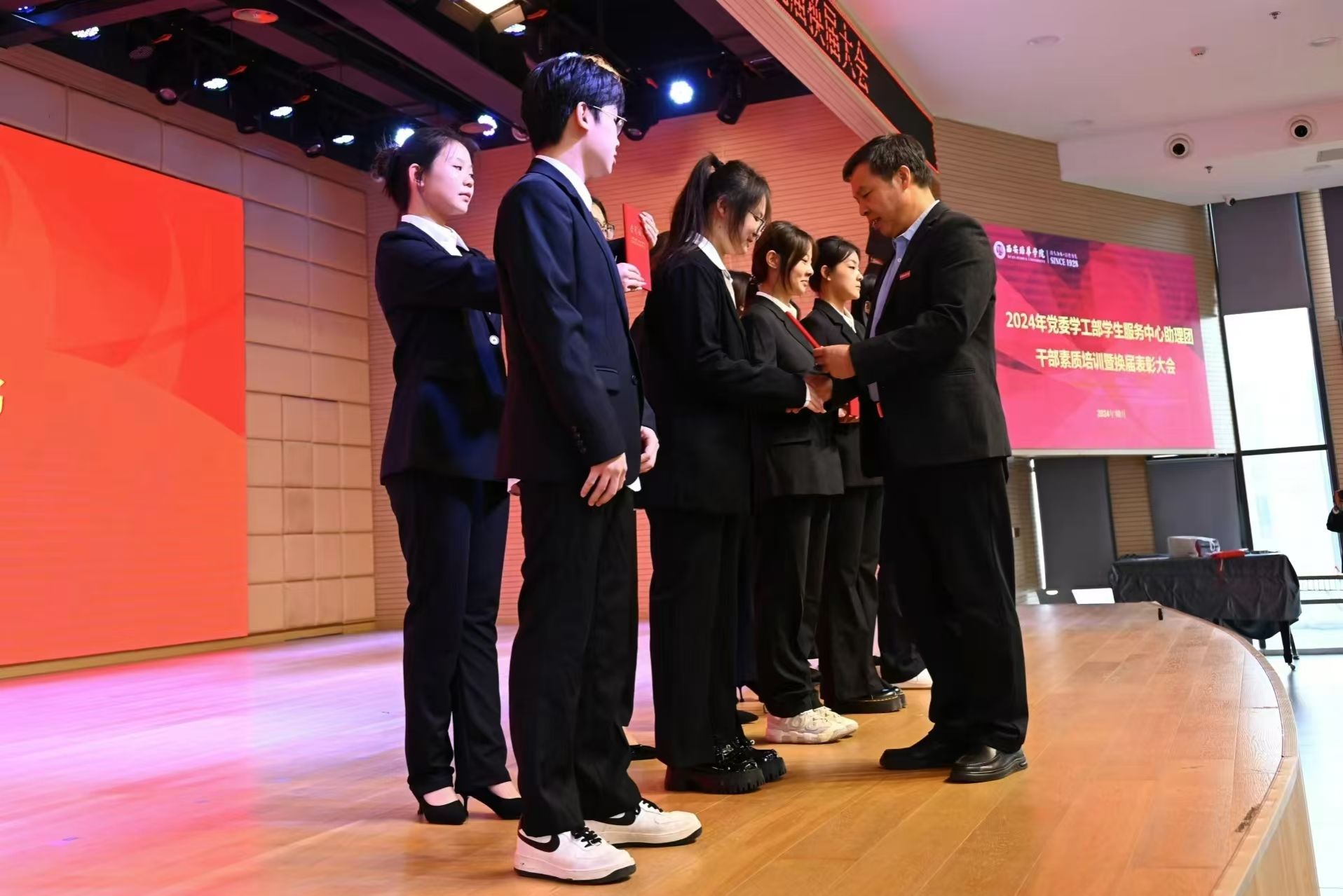 (校团委书记董莹老师、学生服务中心邱含雪老师为主席团成员颁发优秀学生干部荣誉证书及聘书)