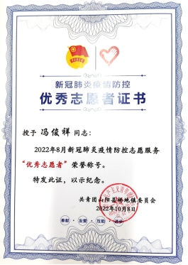 2022年10月,获得杨地镇2022年8月疫情防控志愿服务“优秀志愿者”
