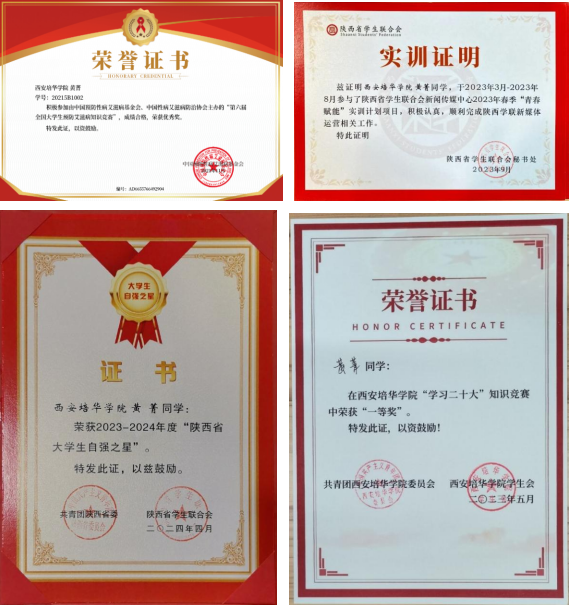 1.2024年4月获评“陕西省大学生自强之星”;