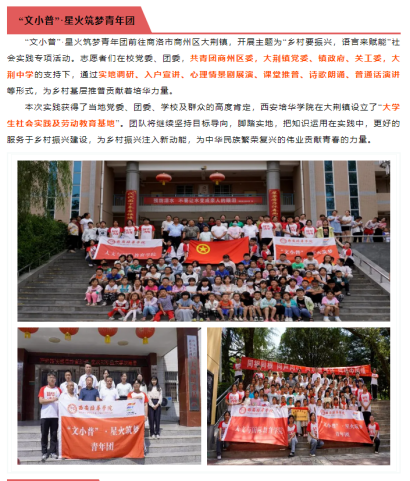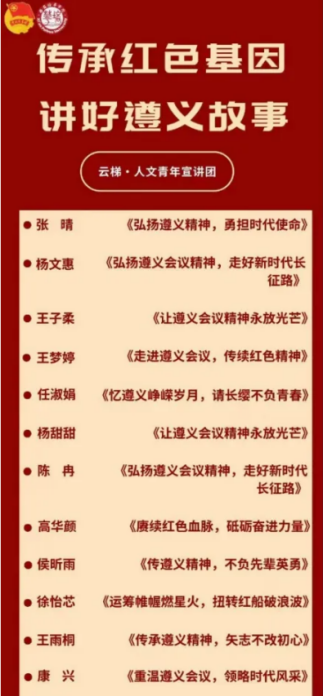 ——传承红色基因。一是学院充分挖掘和利用红色资源,将红色文化融入课程思政育人实践,采用多样化的教学方法,像项目式学习、小组合作学习、翻转课堂、实地考察、调研,打造多元化教学模式;二是依托学院云梯·人文青年宣讲团开展各类主题宣讲,通过专业实践达成思想共识和行动自觉,教育引导广大青年学生牢记初心和使命。