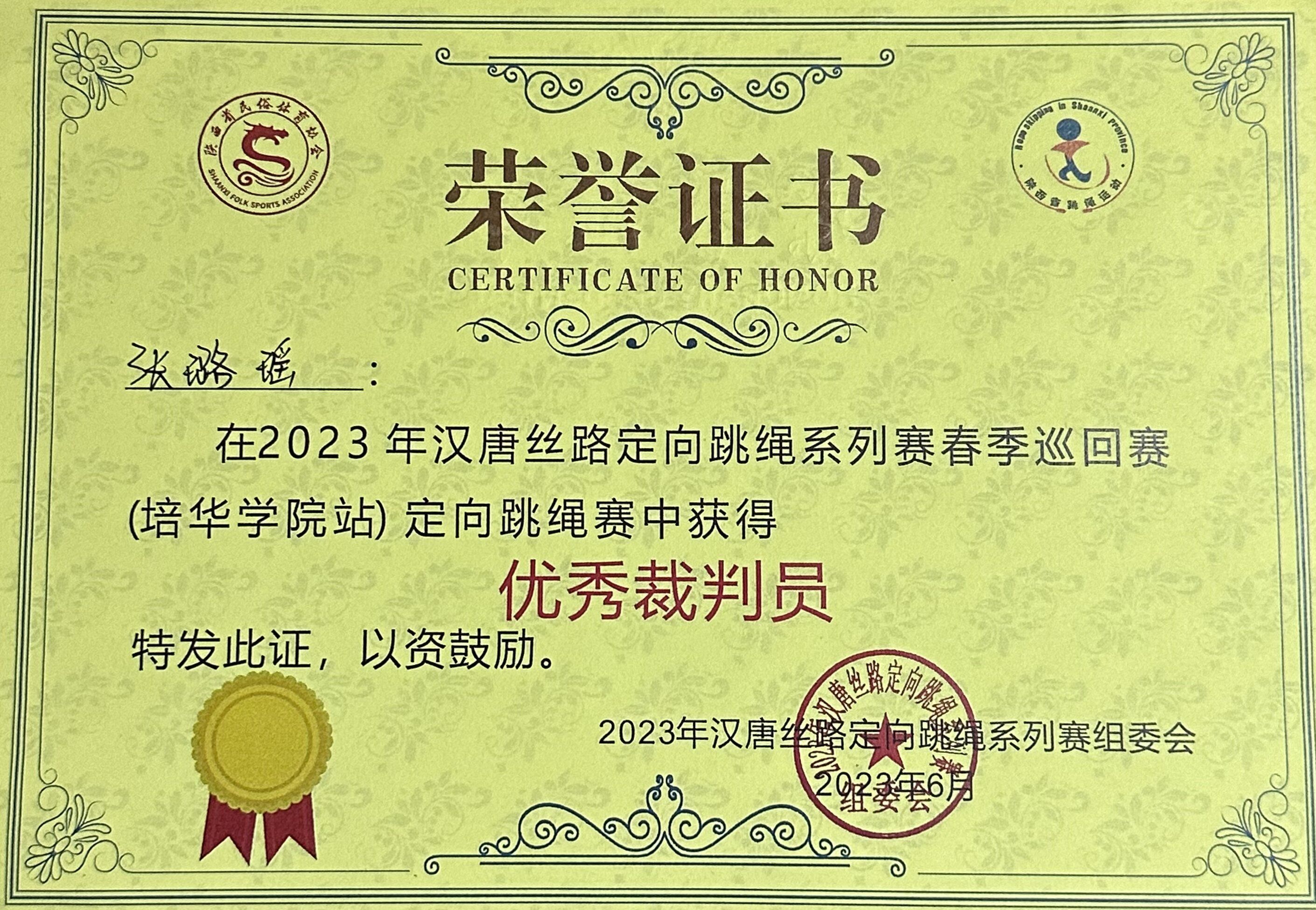 9.2023年6月获汉唐丝路定向跳绳系列赛春季巡回赛(培华学院站)定向跳绳赛优秀裁判员;