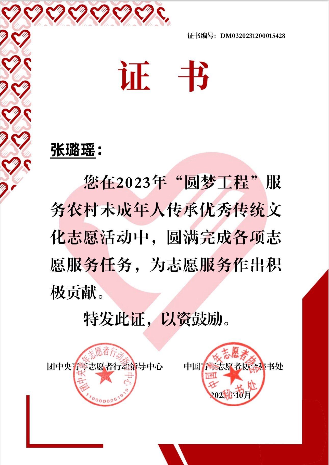 在2023年暑期三下乡社会实践活动中,她所负责的团队成功入选团中央“圆梦工程”服务农村未成年人传承优秀传统文化志愿服务项目,并且被国家级、省市级媒体宣传报道近40次。作为队长,她团结队员,攻克难关,所负责的民族健身操和花样跳绳项目均取得了良好效果。在此期间她也关心爱护留守儿童,深入基层,了解农村,在实践中经风雨、受教育、长才干、做贡献。