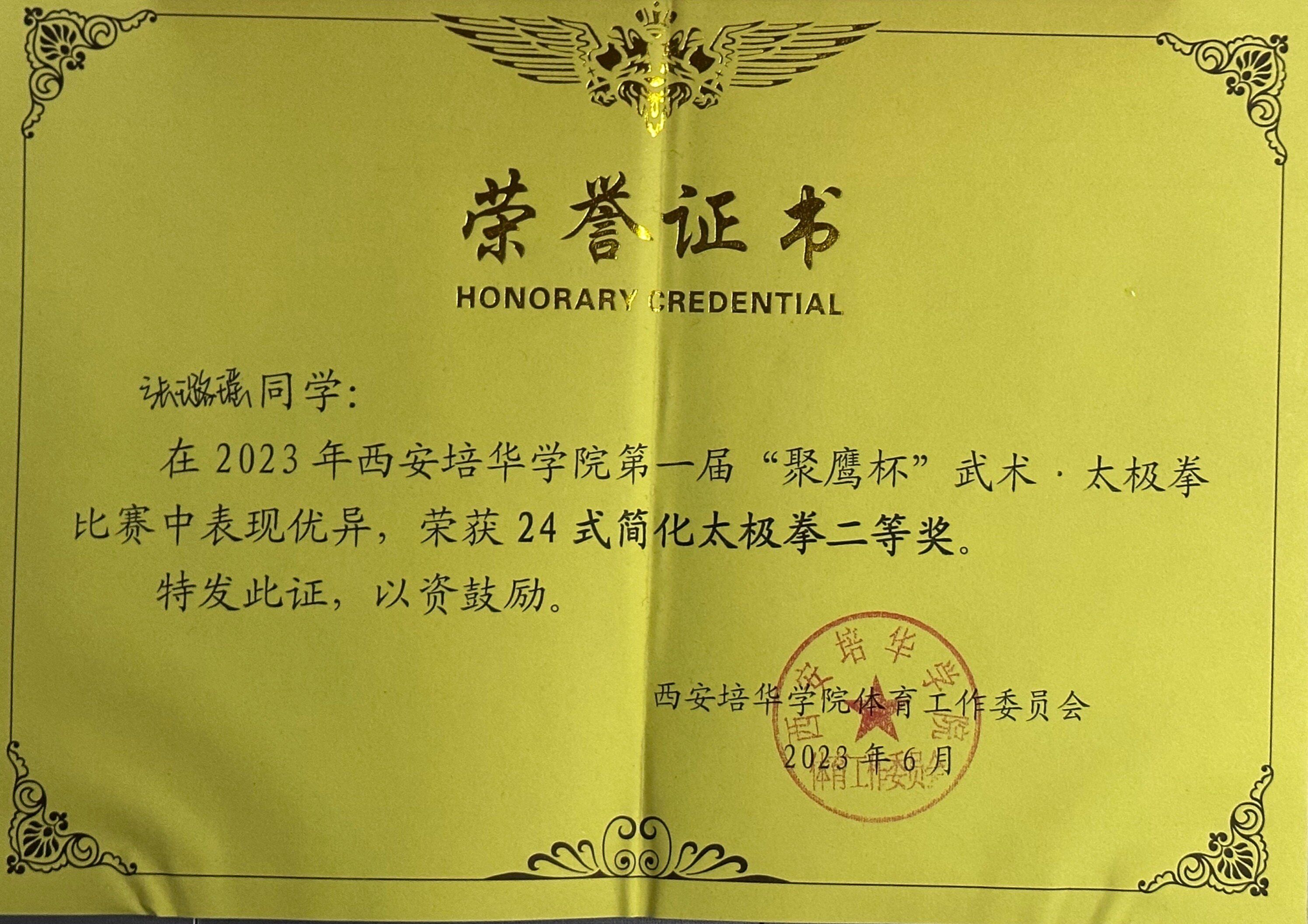 10.2023年6月第一届“聚鹰杯”武术·太极拳比赛获24式简化太极拳二等奖;