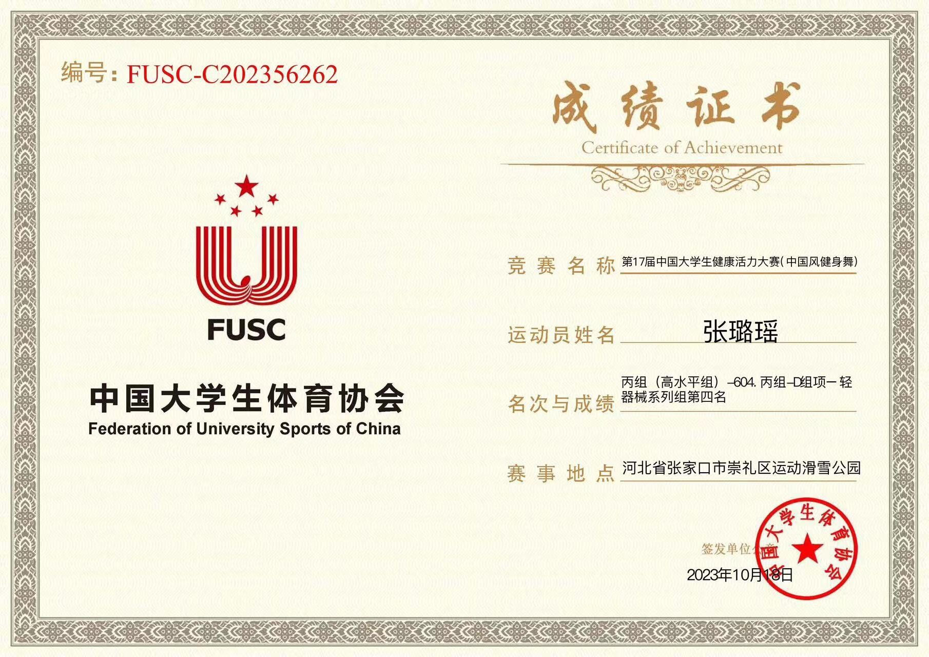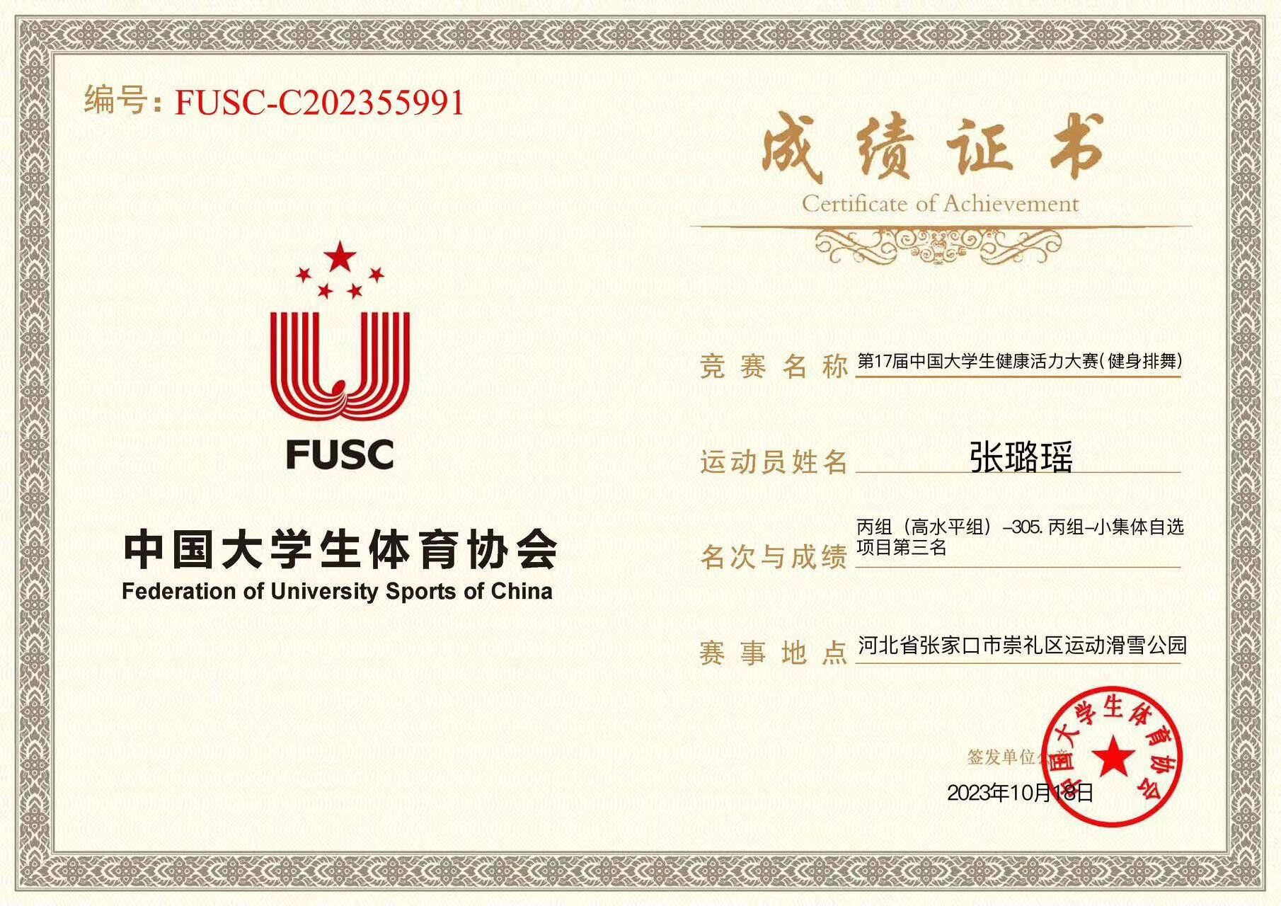 6.2023年10月获第17届中国大学生健康活力大赛(中国风健身舞)丙组轻器械系列第四名、(健身排舞)丙组小集体自选项目第三名、(健身排舞)丙组小集体串烧项目第二名、(健身排舞)丙组小集体规定项目第三名;