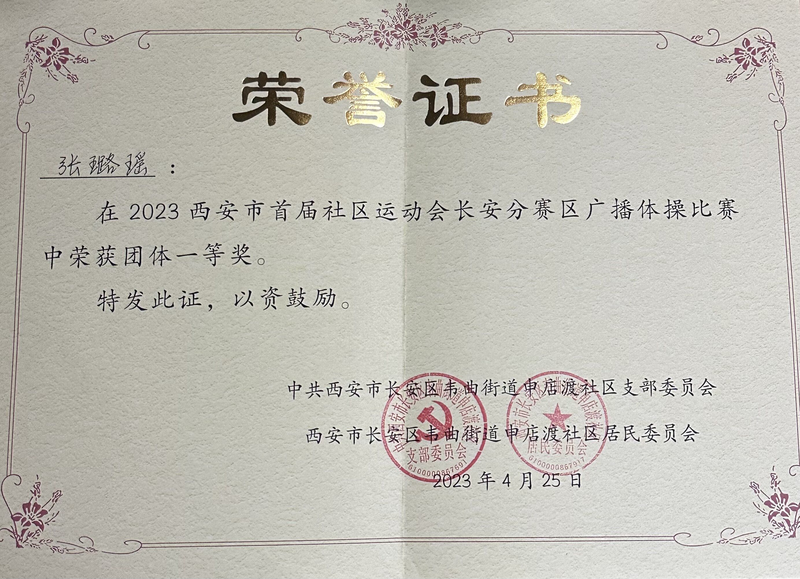 12.2023年4月获西安市首届社区运动会长安分赛区广播体操比赛一等奖;