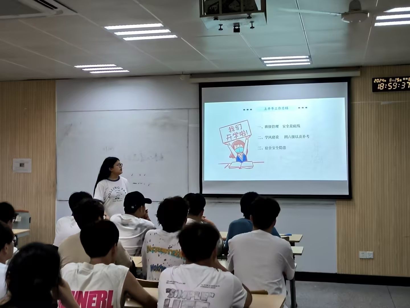 班会中,各班级结合班级学情,对过去一学期班级同学们的表现进行总结。对同学们关心的问题,如期末考试成绩、四六级考试成绩、暑期社会实践开展情况以及班级内发生的好人好事等进行点评和通报。教育引导同学们要调整状态和习惯,从松弛的生活状态中聚焦到专业学习、能力锻炼上,逐步养成科学、规律的生活习惯,保持严谨的学风,合理规划大学学习和生活。尤其在我校2024级新生即将到校之际,倡导学生行为得体、举止文明,穿着文明,注重文明礼仪,树立学长学姐的良好精神面貌。使同学们统一思想,树立目标,回归到学习的主要任务上来的。