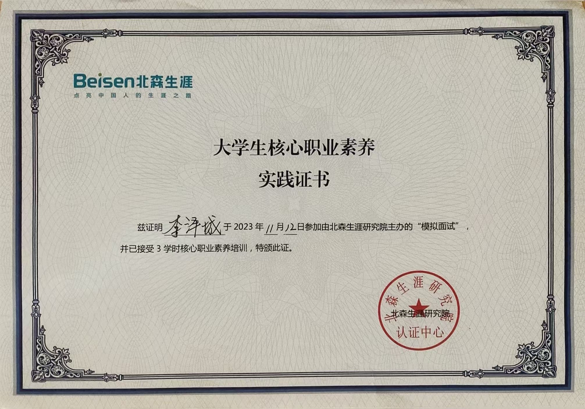 2.2023年11月获北森生涯研究所大学生核心职素养实践证书;