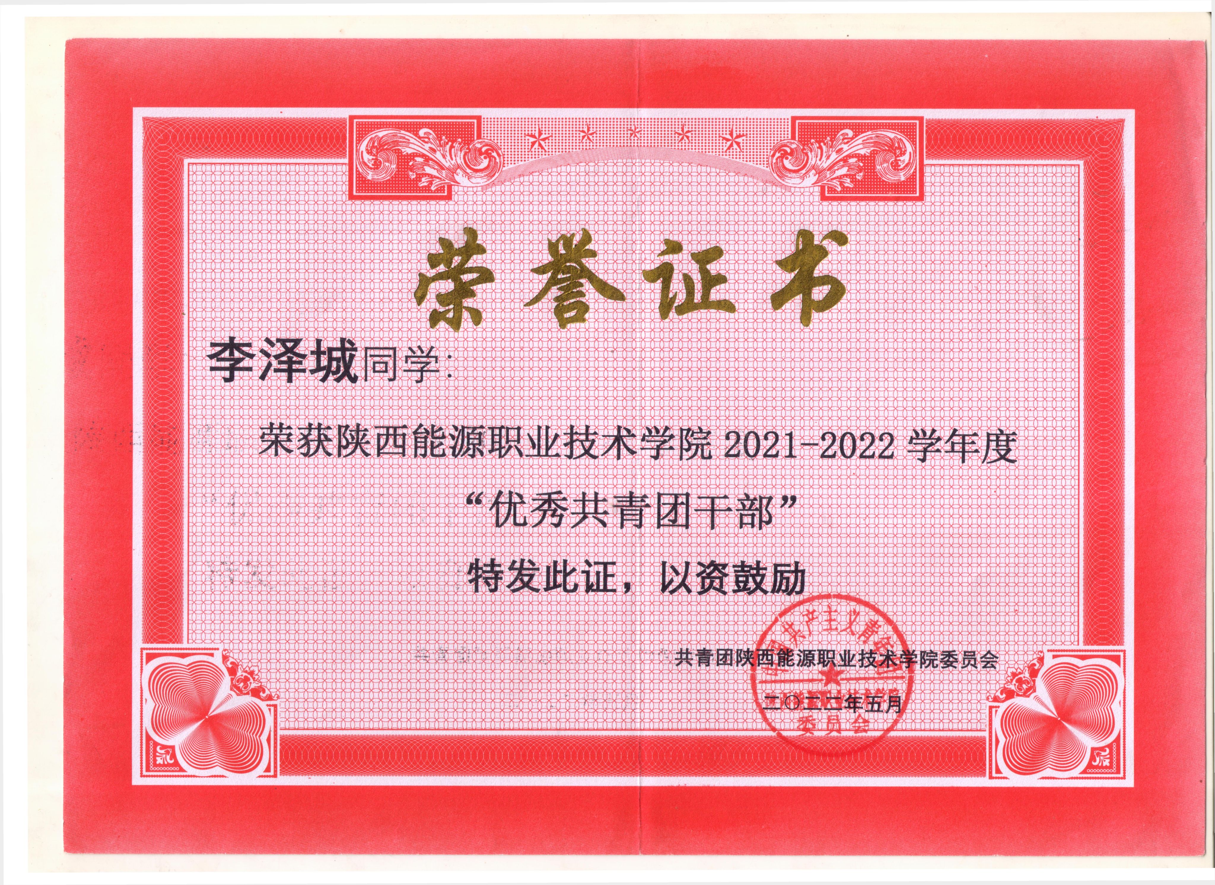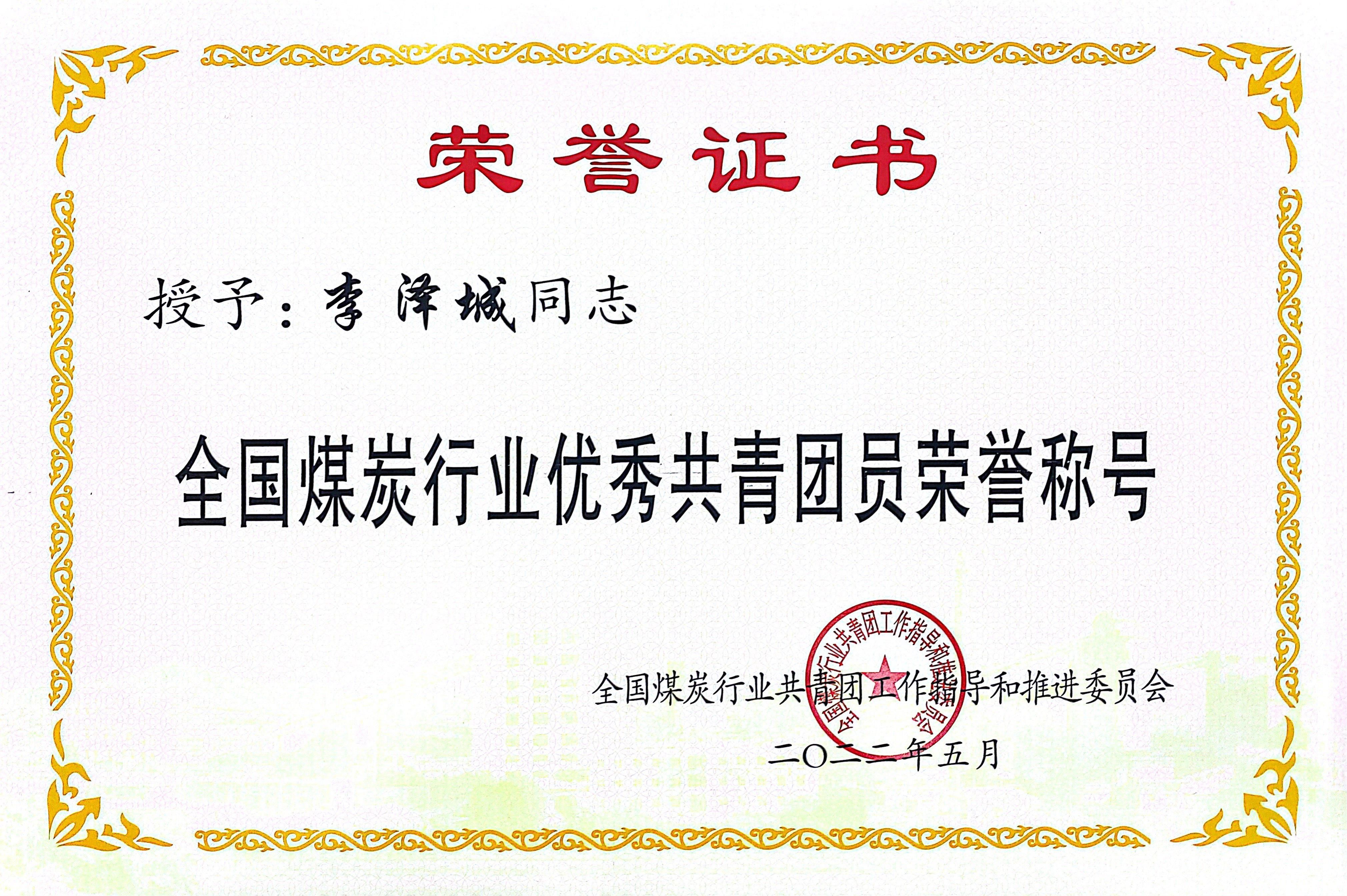 5.2022年5月获全国煤炭行业优秀共青团员荣誉称号;