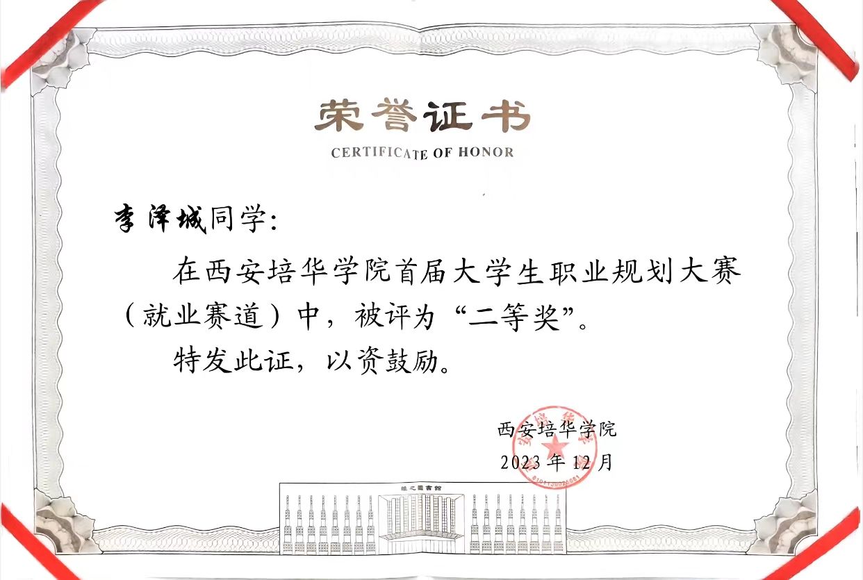 4.2023年12月获西安培华学院首届大学生职业规划大赛(就业赛道)二等奖;