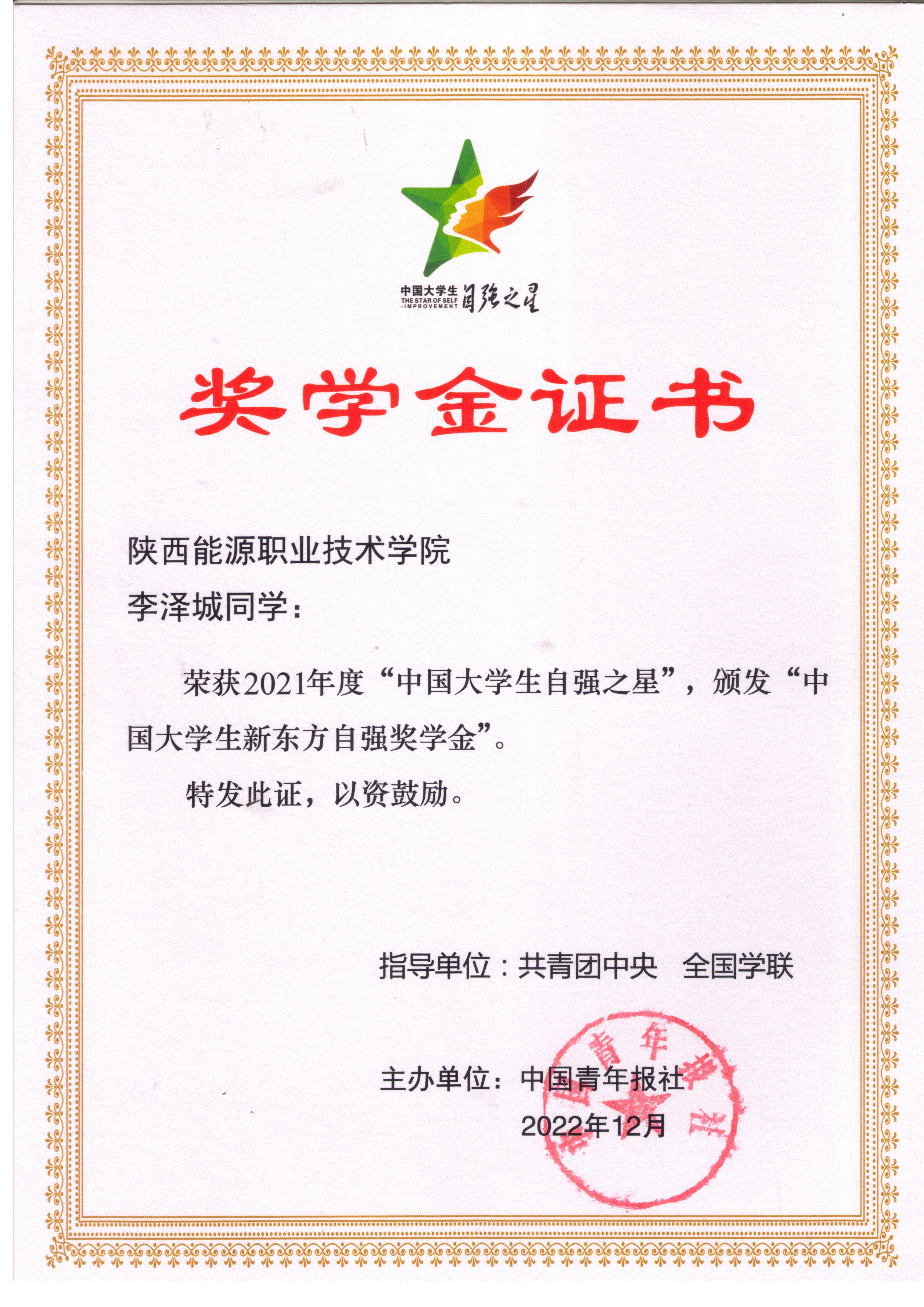 4.2022年12月获中国大学生自强之星荣誉称号;