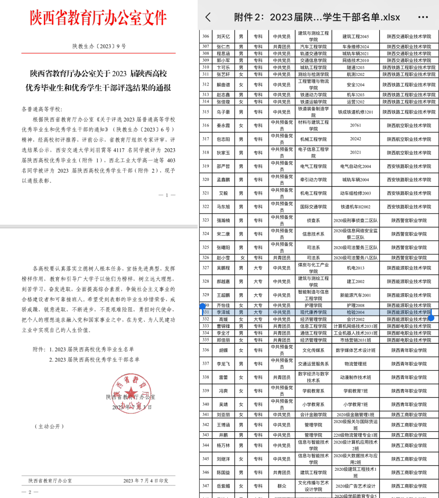 2.2023年7月获陕西省优秀学生干部荣誉称号;
