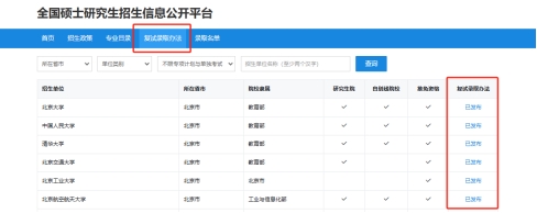 在【全国硕士研究生招生信息公开平台】中点击【复试录取办法】,就可以查看所有院校的复试录取方法,还可以按照省市、单位类别、专项等条件筛选。