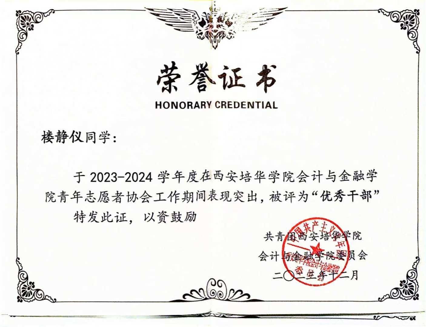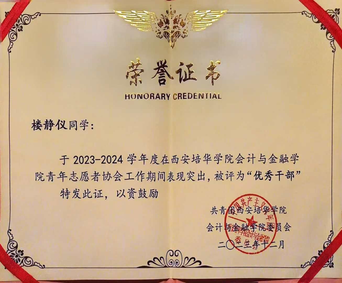 楼静仪,女,汉族,2004年4月出生,中共预备党员,现任西安培华学院会计与金融学院学生潜能发展辅导站干事、大数据与会计2203班权益委员,曾任会计与金融学院青年志愿者协会校友服务部副部长。获评2022-2023学年校级二等奖学金、校优秀共青团员等荣誉称号。