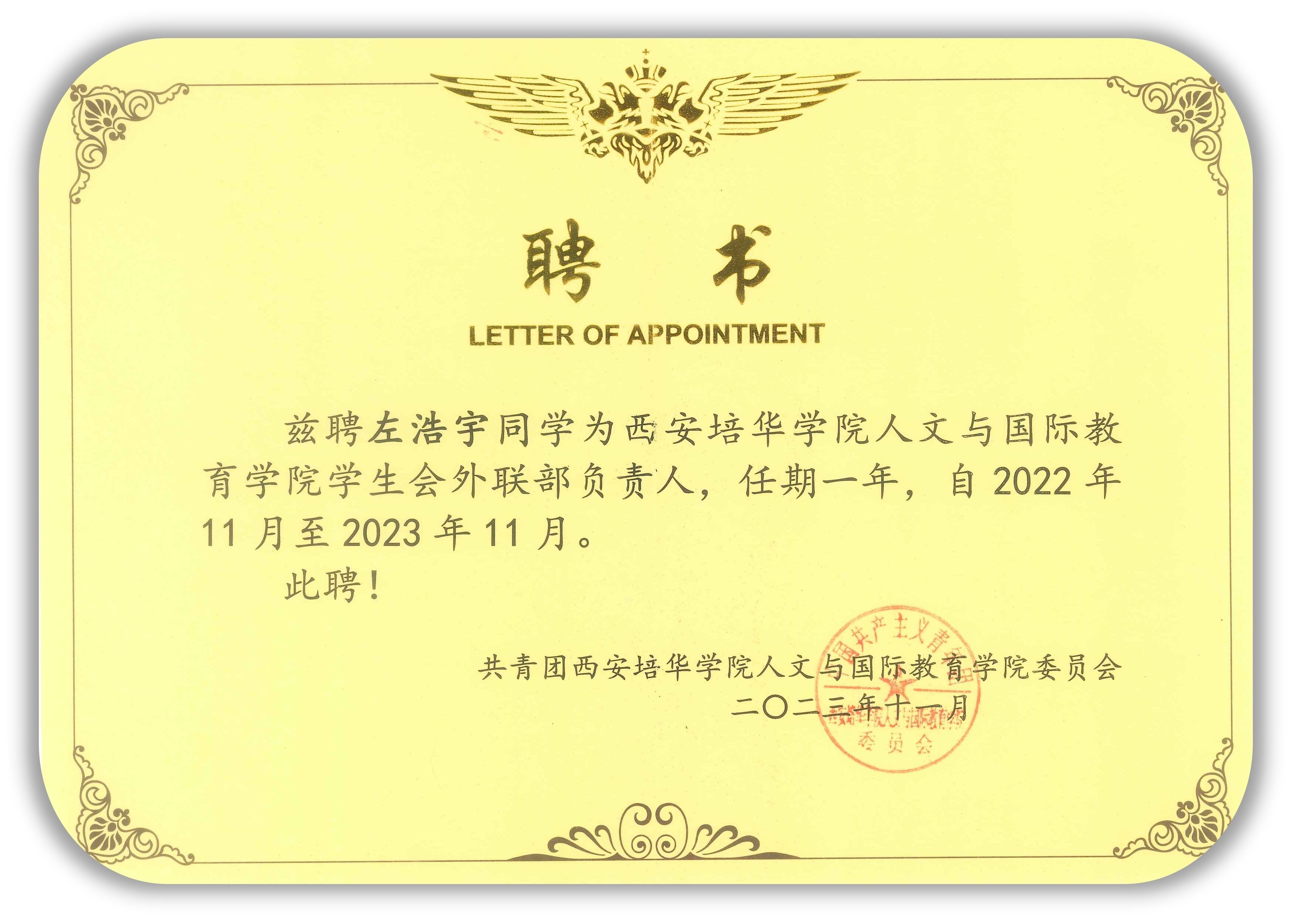 在课余他积极参与各类竞赛,通过竞赛,不断挑战自我,突破自我,将所学知识转化为解决实际问题的能力。在第八届陕西省学生“学宪法 讲宪法”大赛暨国赛选拔赛中他荣获高校组二等奖,总分第二名,为培华取得了历届以来最好的一次成绩。在西安培华学院大学生讲思政公开课大赛中荣获二等奖。参加西安培华学院第十五届“名花有主”求职大赛荣获校级总决赛三等奖。西安培华学院首届大学生职业规划大赛(就业赛道)三等奖。所参与的中国国际大学生创新大赛《有“才”有“财”》项目获陕西赛区省级铜奖、校赛二等奖,《孟孟体育:一家只做中考体育的训练营》项目获校赛二等奖,大学生创新训练计划《以酒为媒——传承酒海技艺》项目获省级立项、推荐为国家级立项。