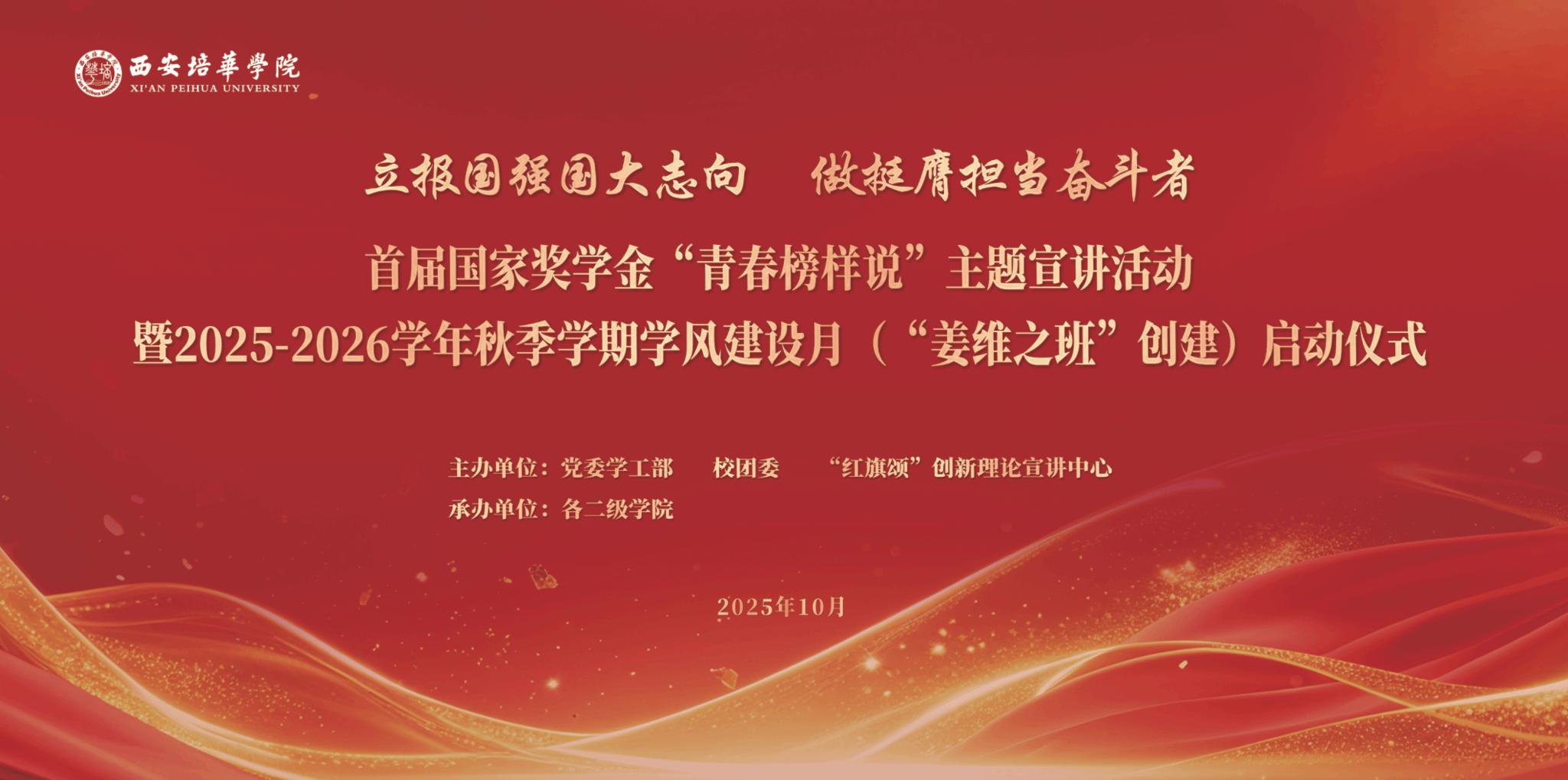 现在,我们诚挚邀请你,亲临西安培华学院首届国家奖学金“青春榜样说”主题宣讲活动暨2025-2026学年秋季学期学风建设月(“姜维之班”创建)启动仪式现场,来寻找答案。