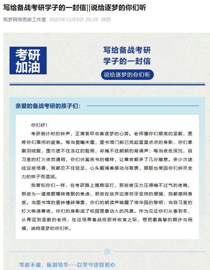 各学院注重物理空间与人文环境的协同建设。医学院通过设立“四级研修室”、优化早读环境,营造沉浸式学习氛围。体育学院将宣讲场地移至训练场,在运动场景中传递奋斗精神。各学院普遍加强教室卫生、出勤纪律等基础管理,同时通过考研自习室专属区域、社区学习空间打造等举措,为学生创造优良的学习环境。文学院持续推进“一站式”育人阵地建设,博雅社区通过学业导师进社区系列品牌活动,将思想引领、文化涵养、学风建设、生涯规划等育人资源直接下沉至学生生活区,打破课堂与生活界限,营造出浸润式、陪伴式、互动式的成长环境。党委学工部开展的考研“送温暖”活动,将关怀直接送达学生宿舍;筑梦网络思政工作室通过一封封温情书信,构建起情感支持空间,体现了学风建设中“刚性约束”与“柔性关怀”的有机结合。