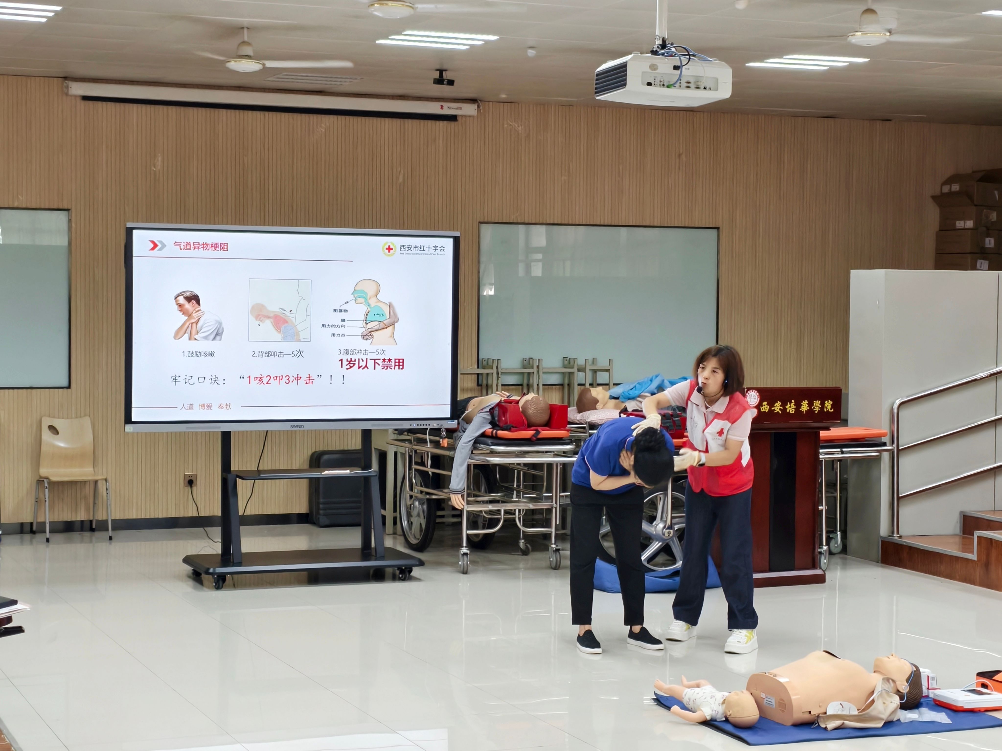 为夯实学生社区安全稳定,保障学生在公寓突发身体不适时,管理员们可以通过急救知识保护学生。学生社区邀请西安市红十字会为公寓管理员和学校后勤工作人员开展“应急救护培训”。