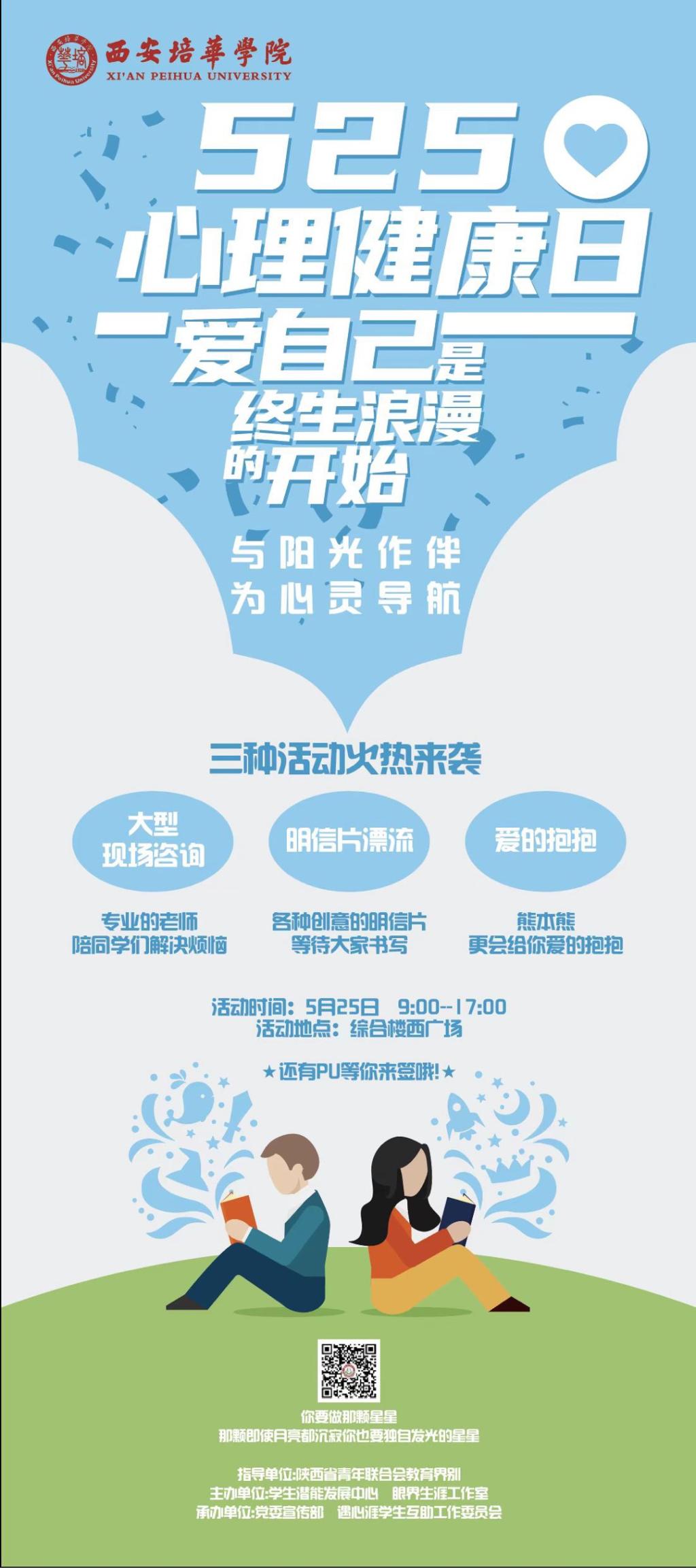 本次525活动,旨在帮助青年大学生关爱自我,了解自我,悦纳自我!关注自己的心理健康和生涯发展,提高自身心理素质,合理规划大学学习和生活,当我们能做到爱自己的时候,我们才具备爱他人的力量。爱自己是终生浪漫的开始,一起来说525(我爱我)吧!
