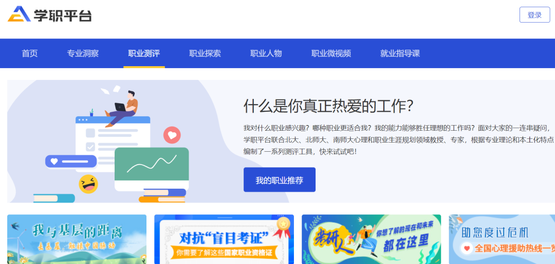 学职平台真是一个宝藏平台,上面不仅有生涯测评,还有对热门行业的专业洞察、来自各行业的人物访谈、职业微视频等内容丰富种类齐全的生涯教育资源,以及涵盖大学生生涯教育多项主题的教育部“互联网+就业指导”公益直播课。