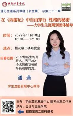 由学校学生潜能发展中心、眼界生涯工作室主办,会计与金融学院承办的“在《西游记》中自由穿行,性格的秘密” 新生生涯规划团体辅导活动于2022年11月10日上午10点30分在恒友楼团体辅导室顺利开展。本次讲座由学生潜能发展中心潘潇老师主讲。