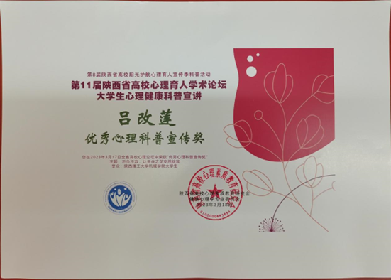另外,本次论坛安排了心理科普活动,吕改莲老师为陕西理工大学机械学院学生进行了《不负不弃,让生命之花安然绽放》主题心理讲座。吕老师讲到充实生命,感恩生命,坚定生命的重要性,并希望大家在生命的每一天,都会珍爱自己的生命,尊重生命,欣赏生命,热爱生活,珍惜生活,创造生活,无论发生何种困难,永不放弃生的希望。在短暂的人生路上,始终保持乐观的态度,享受人生的幸福!同学们深受激励,反映讲座很精彩,心灵很受益!