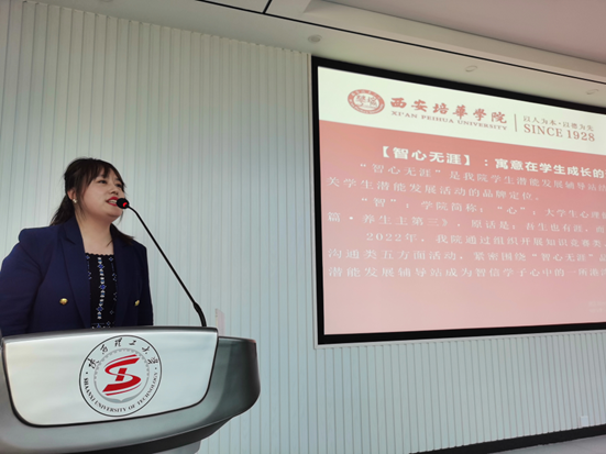 青年学者论坛中,高珊珊老师以《智心无涯润心育人——二级学院潜能发展辅导站为学生成长护航》为题,向与会高校介绍了我校智能科学与信息工程学院学生潜能发展辅导站的工作架构和特色。她谈到辅导站的工作架构和特色是以学校潜能发展中心为核心,学院辅导站为辅助,不断完善"宿舍-班级-院系-学校"四级心理育人网络,充分调动辅导员、心理委员、团学干部等心理育人队伍,形成育人合力,多方联动,发挥各自职能优势,构建关心、关爱学生心理健康的育人生态,从而落实立德树人根本任务,完善学院思想政治工作体系建设,促进心理育人工作高质量发展。