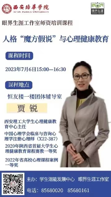 为切实提升我校心理健康教师的专业化水平,推进学校“课程思政”改革和大学生心理健康教育课程建设,7月6日下午,学生潜能发展中心特邀西安理工大学心理健康教育中心主任贾锐主任为我校《心理健康教育》和《职业生涯规划与就业指导课》代课教师做了以《人格“魔方假说”与心理健康教育》为主题的线下示范课。本次教学活动由学生潜能发展中心主任韩赟主持。