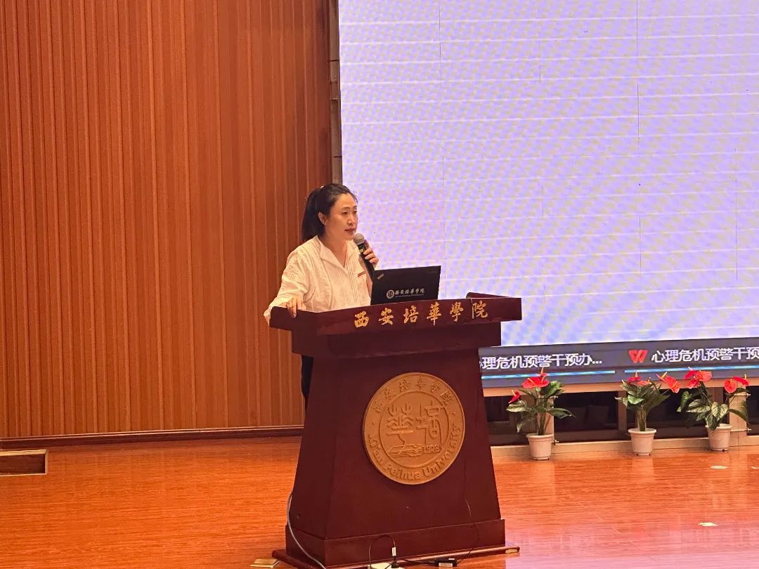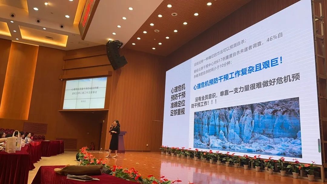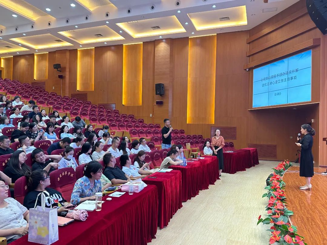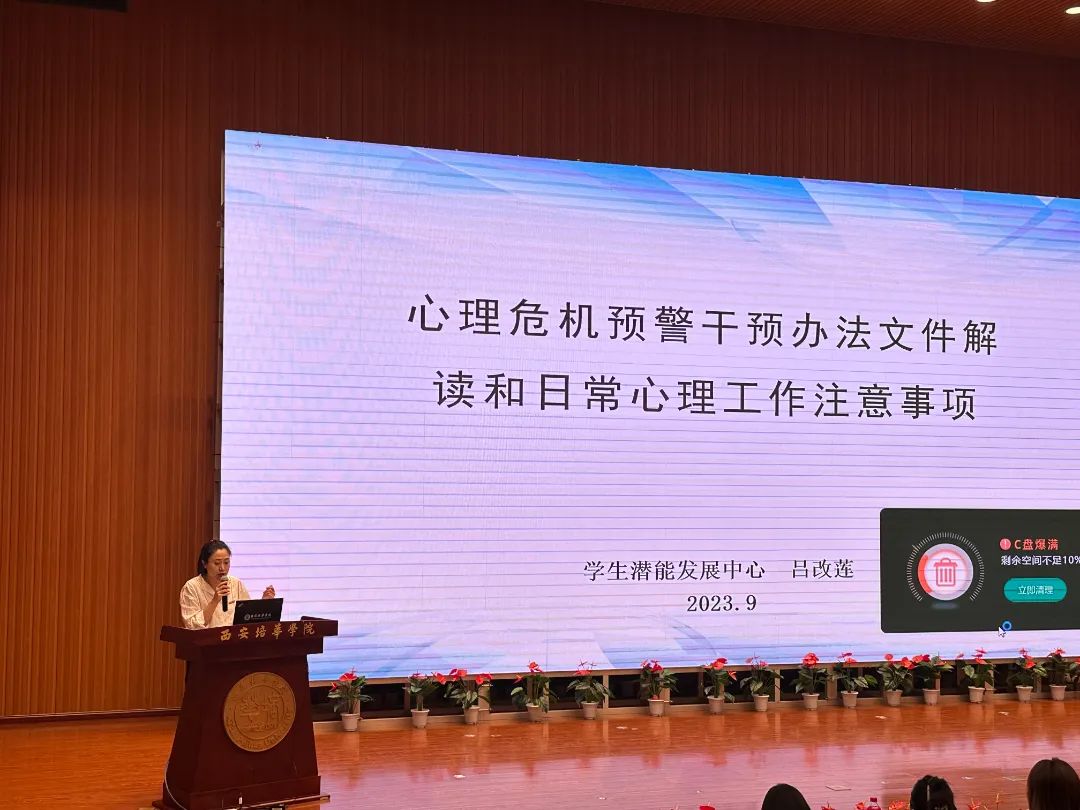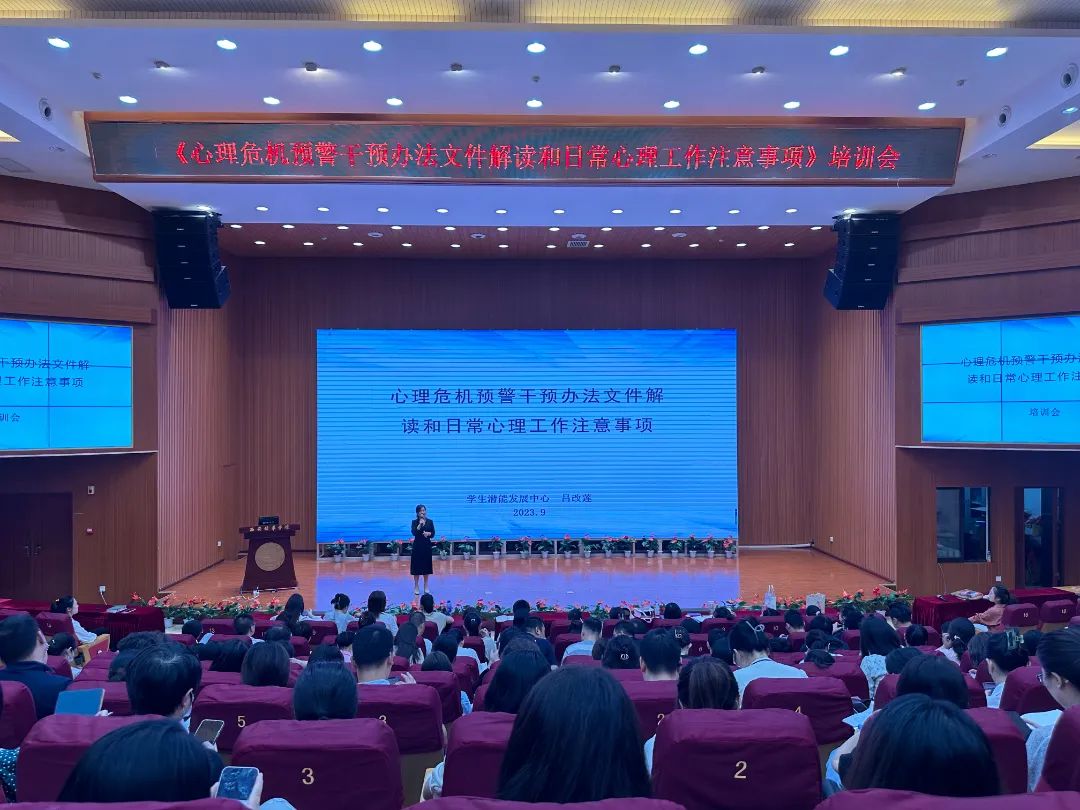 随着社会的快速发展和竞争的加剧,加之生存环境的日益复杂,学生心理问题日益突出,危机事件频发,高校心理健康教育工作面临严峻的挑战,巨大的压力。为提高我校辅导员心理健康教育工作水平,强化预防和干预学生心理危机的业务能力,有效防范化解危机事件发生。2023年9月8日14:30学生潜能发展中心吕改莲老师在校图书馆报告厅就《心理危机预警干预办法文件解读和日常心理工作注意事项》做了专题培训,培训由韩赟主任主持,学生潜能发展中心主任韩赟、全体辅导员及学生潜能发展中心等百余名老师参加了培训。