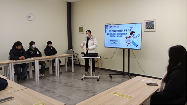 2023年12月14日,下午16:00--17:30,第十六期个人成长训练营在恒友楼二楼知爱室如,由学生潜能发展中心叶腾老师带期举行,本期成长的主题是“摆脱手机依赖,精彩校园生活”领,来自智能科学与信息工程学院的12名学生倾情参与。