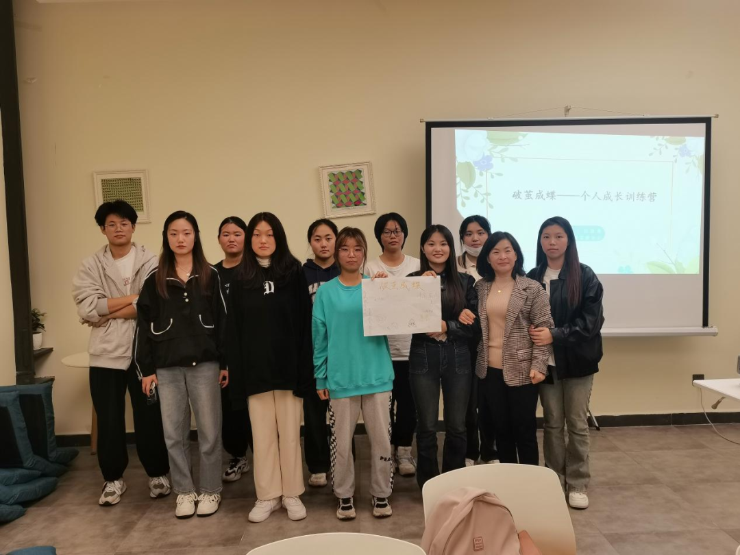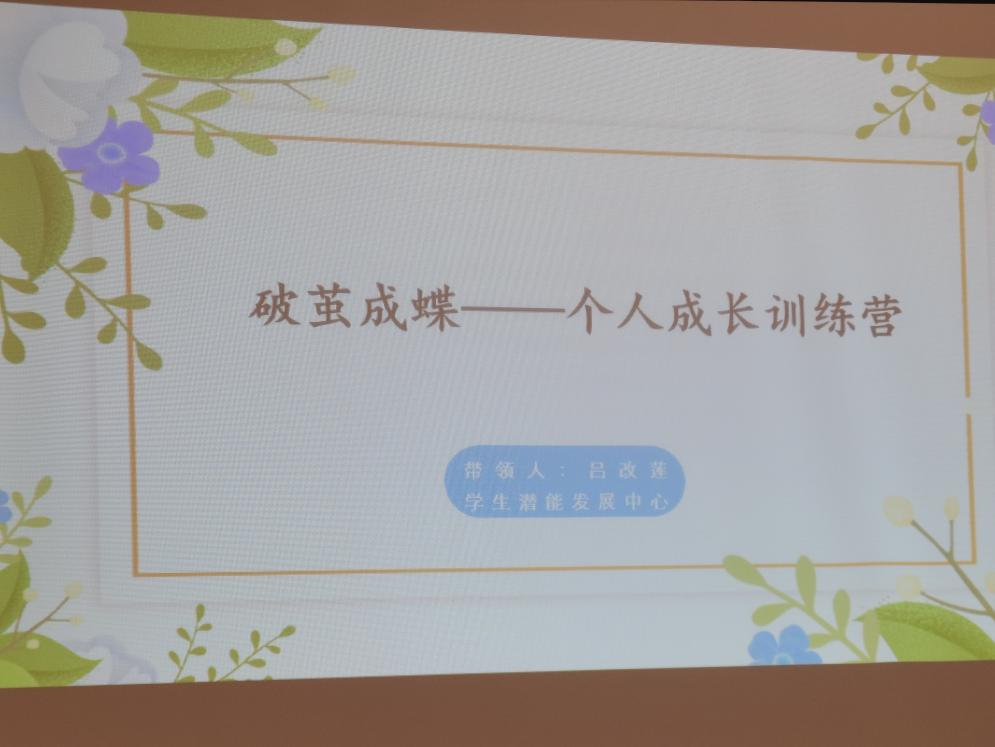 为了帮助学生深度分析自我,激发学生对美好的向往,促使学生明确社会角色,提升个人价值感,增强自信心,提高学习积极性,养成良好的自律习惯,最终,破茧成蝶。10月9日晚19: 00由学生潜能发展中心组织的破茧成蝶个人成长训练营第一期在知爱室如期开始。训练营共招募10名同学参加,由吕改莲老师带领。