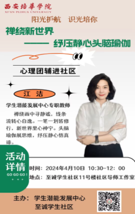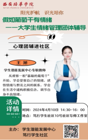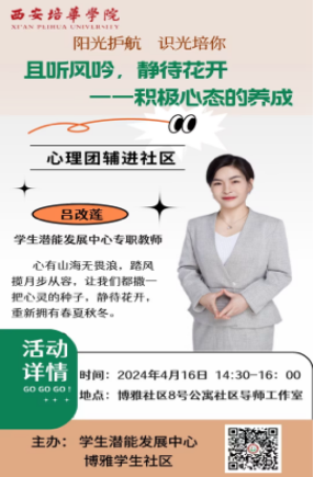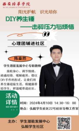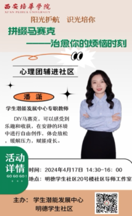 为了有效推进我校大学生心理健康教育工作的优质建设,学生潜能发展中心的8位专职教师自4月10日至4月17日,积极推进了一系列心理团辅进社区的活动,以此助力“一站式”学生社区综合管理模式的建设,并对学生予以关怀和帮扶。其目的在于提升学生的心理素质与自我调节能力,为大学生未来的发展奠定坚实的基础。