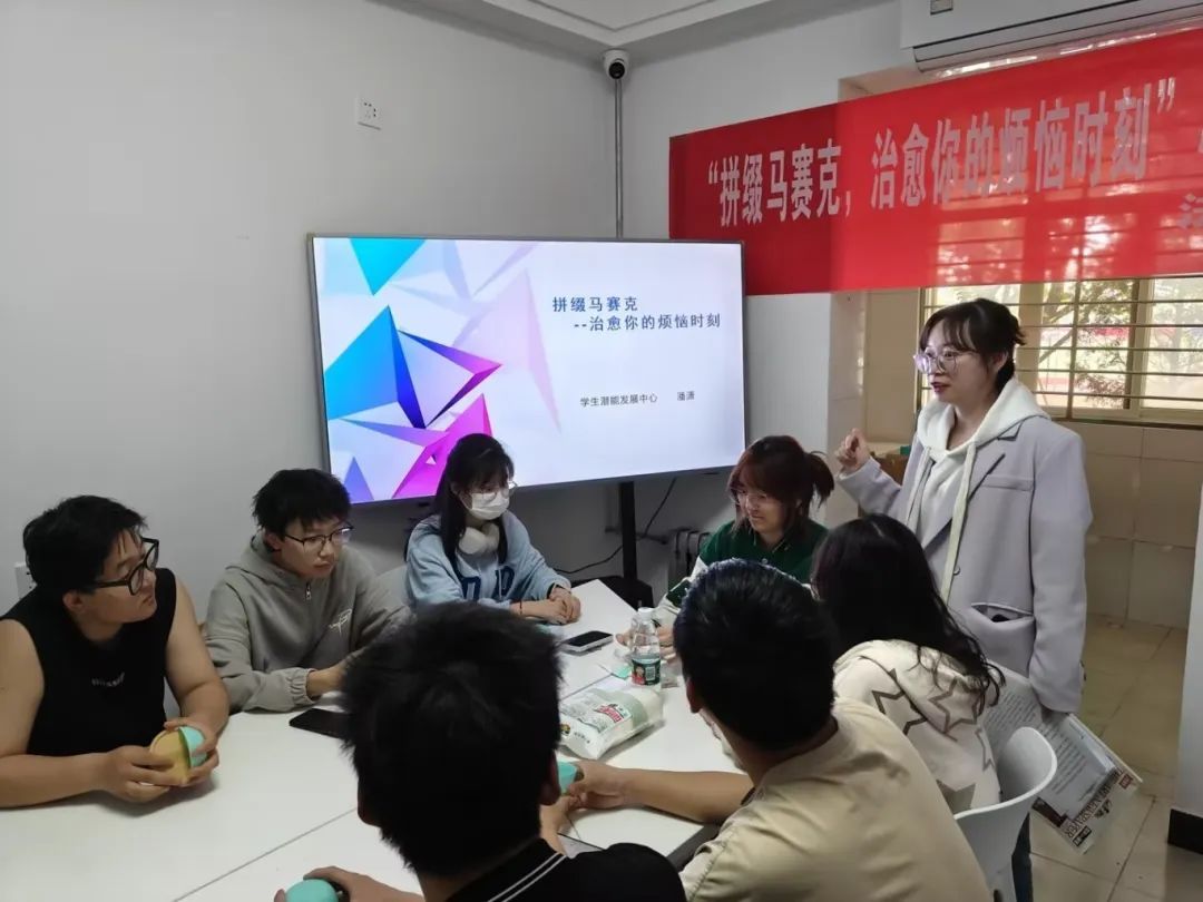 由潘潇老师带领的心理团体辅导以创作为主题,利用马赛克材料帮助大家自由创作缓解压力,消除烦恼。在整个团体辅导的过程中,我们通过“看一看”“摸一摸”“做一做”来进行,看到我们日常生活中的烦恼,摸到解决烦恼的方法,手工制作缓解烦恼。通过细致的创作,静静地坐在桌前,将自己融入其中,沉浸在手作地世界中,对心理进行疗愈,从而达到内心平衡,情绪也会变平缓。