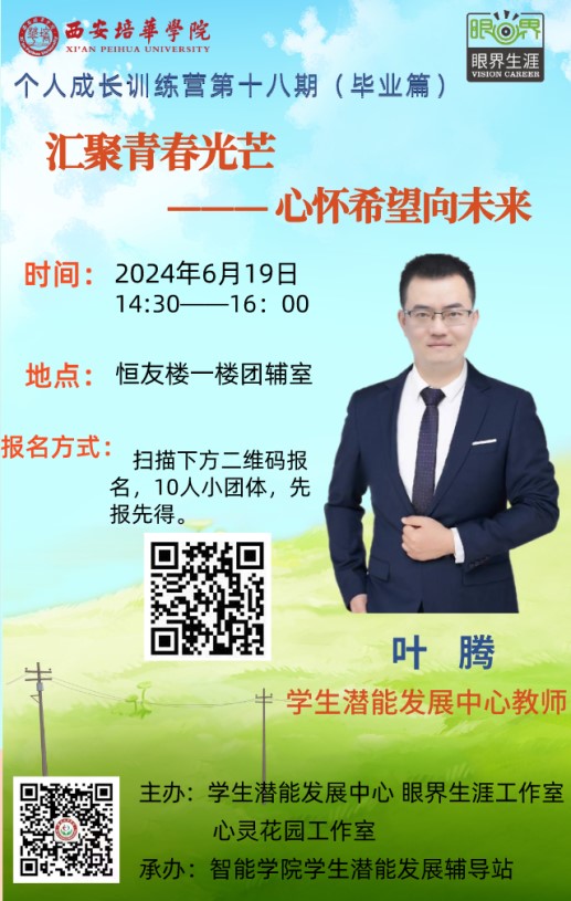 青春是一首激昂的乐章,每一个音符都充满了活力与希望。当毕业的钟声缓缓敲响,又一届的毕业生们即将告别熟悉的校园,踏上新的人生征程,在这个充满离别与不舍的时刻,为了更好地帮助他们处理应对这种离别的情绪,学生潜能发展中心特别组织了本次个人成长训练营第十八期《汇聚青春光芒——心怀希望向未来》(毕业篇)的团辅活动,旨在引导他们调整心态,以更加积极、坚定的姿态面对未来的挑战。