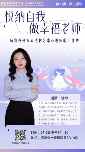 由教师教学发展中心组织的“三坊三营七大沙龙”之第13期师说漫谈“悦纳自我 做幸福老师”工作坊于9月5日14:30在恒友楼团体辅导室准时开始。本次工作坊由学生潜能发展中心潘溓老师带领,本期活动聚焦于马赛克拼缀,在艺术中感受个人成长。人文与国际教育学院、会计与金融学院、女子学院等二级学院多位老师踊跃参与,共同探讨烦恼压力出现时,如何以积极阳光的心态去面对。