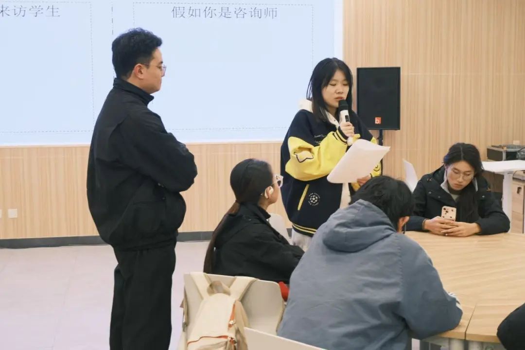 “来访学生”与“咨询师”小组交流犹如一场场激烈的智慧交锋,在同学们思维碰撞的过程中,大家有着不同视角的交融与互补,凝练总结出包括咨询师的形象、举止、态度;咨询场地的空间、布置、环境;咨询过程的内容、方式、效果等,都是来访者比较在意和期待的且是咨询师应该准备和做到的细节。初诊接待其实就是心理咨询师与来访者的第一次会面,这看似简单的初次相见,却承载着诸多环节和重要意义。只有切身感受了,才能真正理解初诊接待的微妙与关键。当来访者带着满心的困扰与迷茫踏入咨询室的那一刻,他们所期望的不仅仅是专业的答疑解惑,更是一种被全然接纳与理解的温暖。