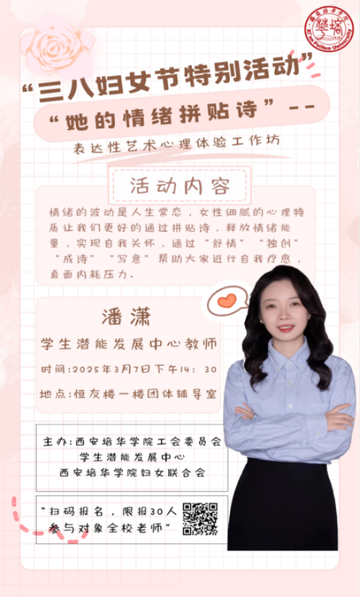 为帮助教师释放情绪能量,实现自我关怀,值此三八节来临,3月7日下午14:30,学生潜能发展中心,眼界生涯工作室举办了主题为“她的情绪拼贴诗”表达性艺术心理体验工作坊。本次工作坊由潘潇老师主讲,各学院共计30人参与。