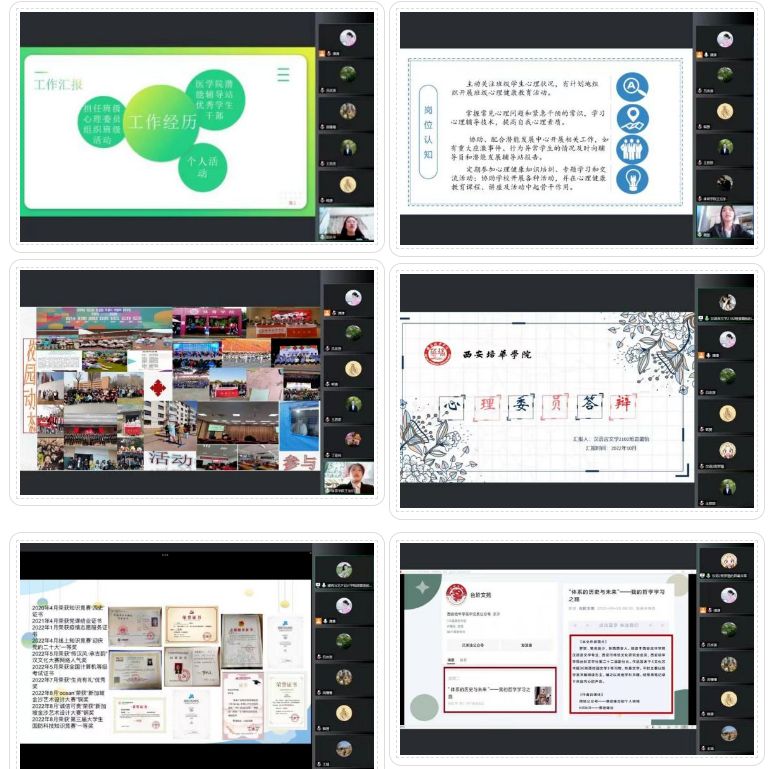 经过各心理委员对心理主题相关工作,包括集体活动、竞赛、获奖、特色活动、工作思考等方面的汇报,评委老师对基础材料与线上汇报综合评选,最终确定评选结果如下: