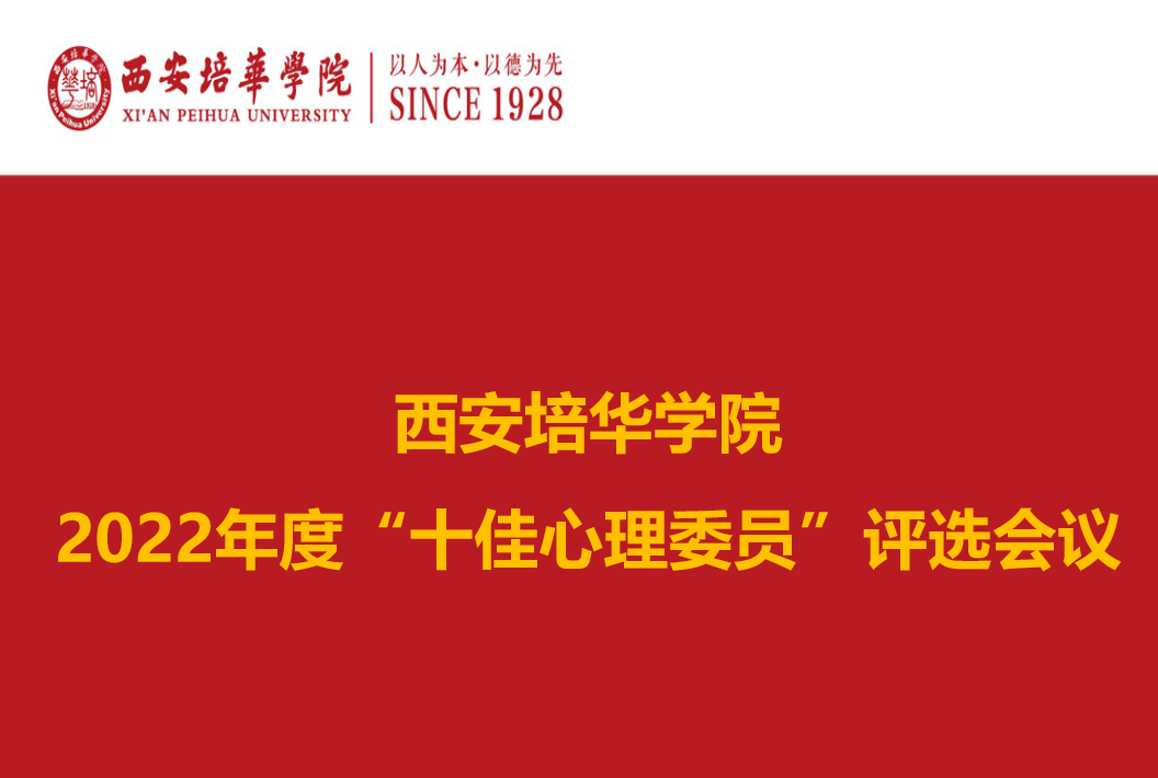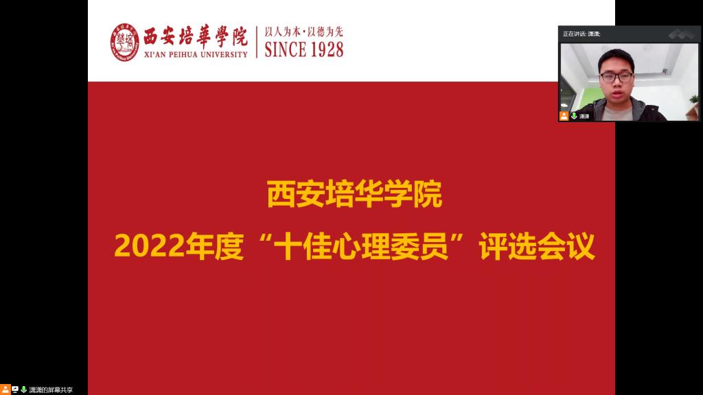 为充分发挥大学生心理委员朋辈辅导、同伴教育中的重要作用,推动班级心理健康文化的发展,培养心理委员的责任与服务意识,在心理委员队伍中树立先进典型,传播积极的班级心理健康教育工作理念,10月19日上午10点,因疫情原因,西安培华学院组织开展了2022学年校园“十佳心理委员”先进个人线上评选会议。