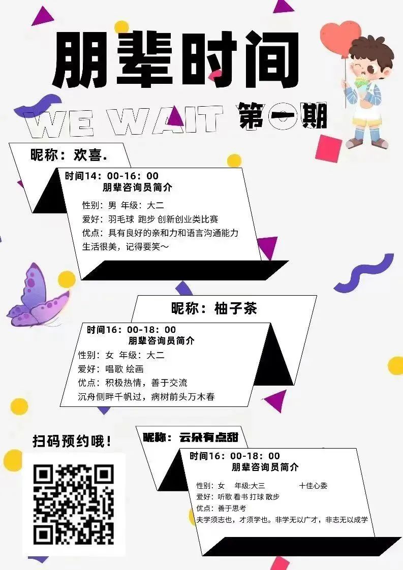 本期朋辈心理咨询员安排如下,同学们可根据自己时间按需预约(扫描下方图中二维码预约)。