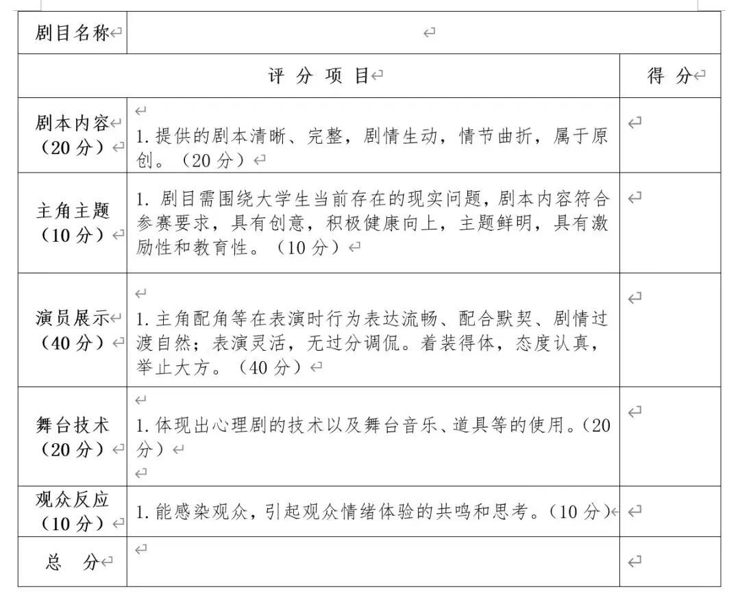 5、心理剧表演,时间为10-15分钟,要充分运用各种表演形式,恰当使用道具,要做到表演形式的直观、生动、有趣。