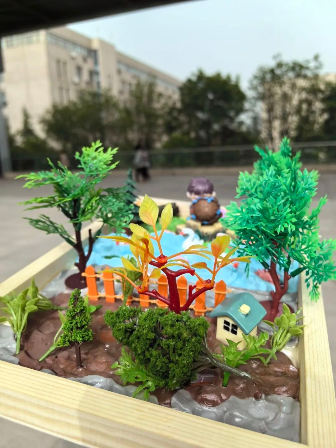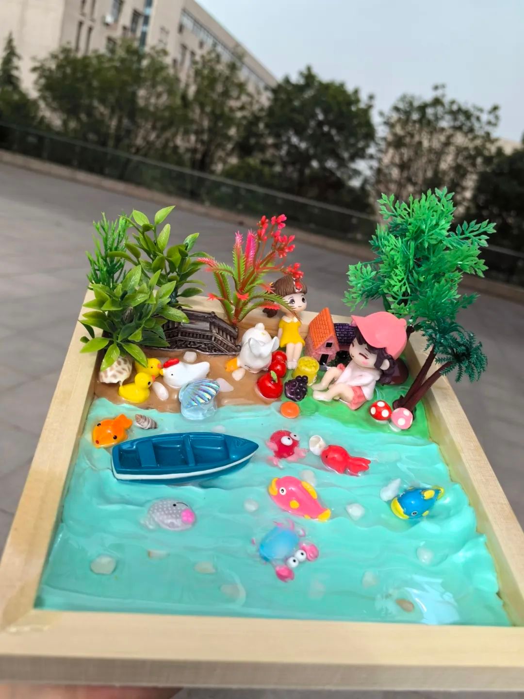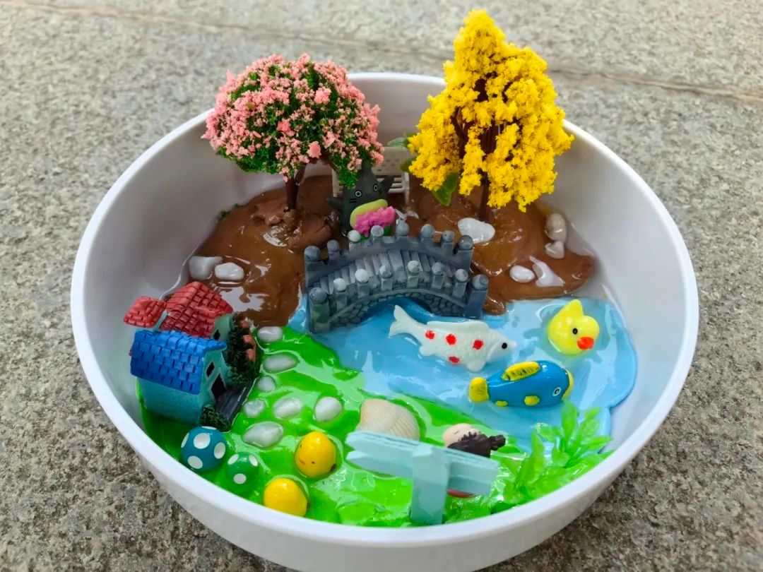 十分难得十分舒畅的体验,在快要奔二的年纪还能体验一把儿时的手工快乐。我想以一个孩子的身份思考未来的世界会是什么样子。未来是美好的,无忧无虑的,有好玩的游泳池,美丽的花草树木,是个生机盎然的世界。现实是,在未来,生活压力只多不少,与日俱增的就业压力和物价水平只会让人活得身心俱疲,这就是现代和不远的将来大部分大人的生活。而与之相对的就是自然和儿童。作品中鸭子代表着未来的我,回归童真,无忧无虑地活在大自然的世界中,摆脱繁忙,返璞归真。要想实现无忧无虑的生活,摆脱压力,实现物质上和精神上的双重满足,物质是必要的基础。那么就要努力挣钱,要努力挣钱就要努力学习。这是个十分现实也是无奈的结论,不过我们依然要乐观面对现实,向着自己的目标砥砺前行。