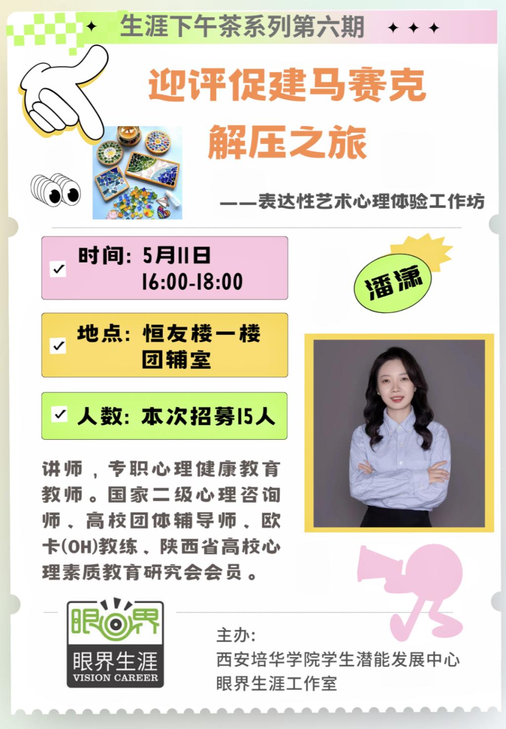 为了帮助学校辅导员队伍减轻压力,学会运用积极心理学的知识和方法,形成乐观向上、充满自信的态度,以阳光心态去生活和工作。5月11日下午16:00,学生潜能发展中心,眼界生涯工作室举办了主题为“迎评促建马赛克解压之旅”生涯下午茶第六期。本次工作坊由潘潇老师主讲,校内辅导员共计15人参与。