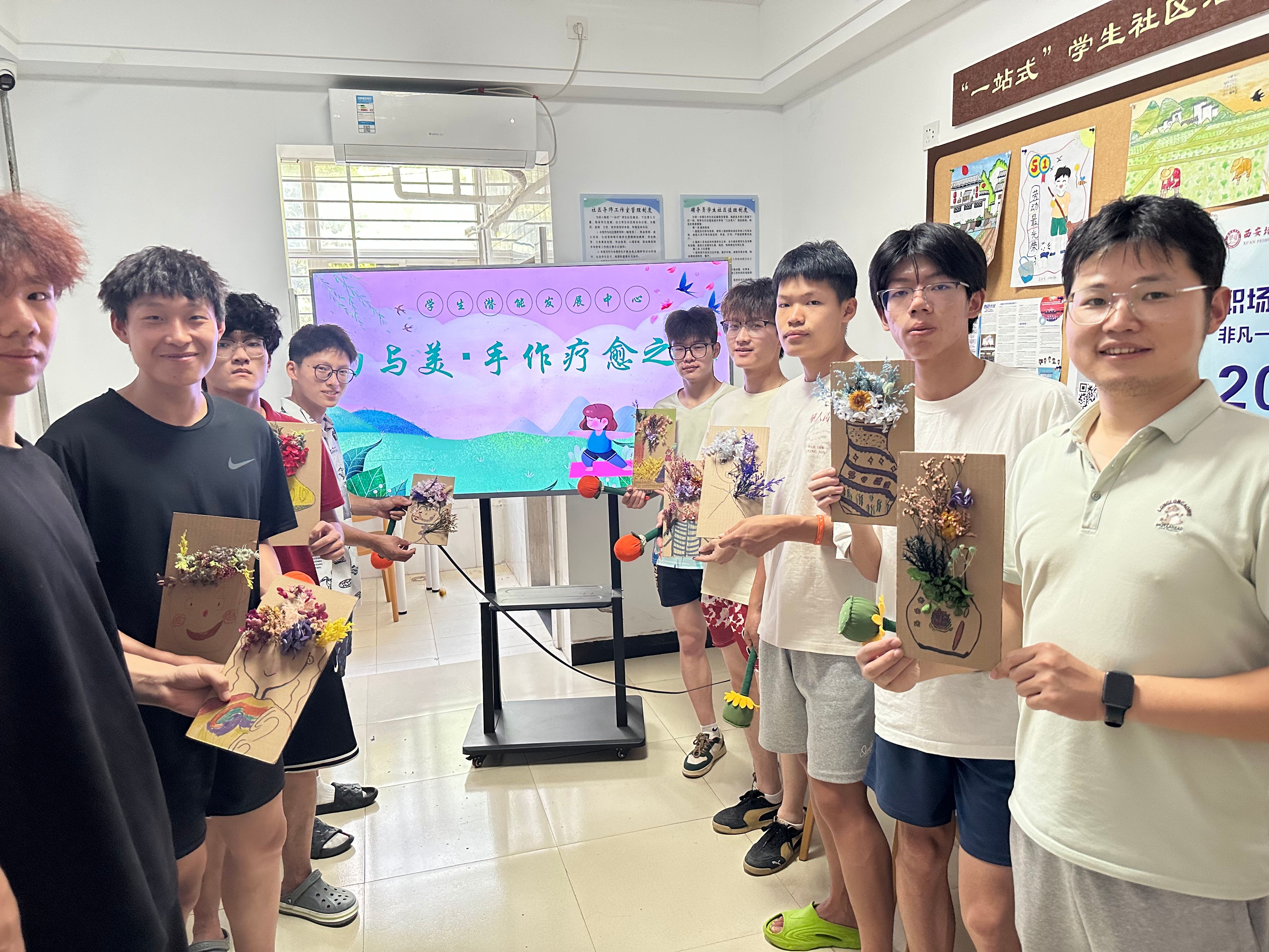 6月12日下午,由学生潜能发展中心陈豪然老师带领体育学院十名学生在弘毅学生社区开展“力与美·手作疗愈之旅”活动。此次活动是针对体育学生的特别活动,对于日常较强的运动量,身体和心理的放松都显得尤为重要。一场融合艺术与养生的奇妙之旅,借以DIY手作的形式,社区团辅赋能,让学生在制作手工的过程中得到心理的放松、压力的释放,将健康带给学生,把温暖带进社区。