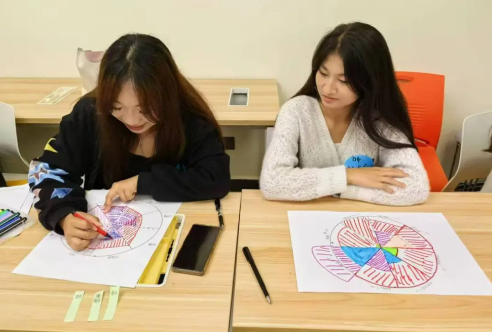 接下来同学们书写出自己理想的大学生活状态,描述着自己未来美好的生活愿景。在思考了为了实现这美好的生活愿景需要做出哪些努力之后,带领教师引导团体成员通过描绘自己的生涯平衡轮,从全局角度审视当下,再根据自己的期待制定行动计划。每位成员绘制完毕后分别分享了自己的平衡轮。