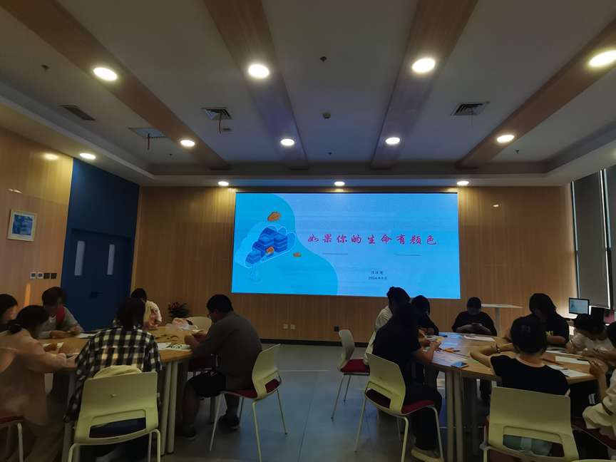 众多研究和实践表明,越来越多的青少年生命意义感欠缺,他们认识不到生命的意义,看不到自身的价值,因此变得迷茫、浑噩、心理状态不佳。为使我校大学生能够有意识的去发现生命的意义,去创造、充实生命的意义,提升同学们的生命意义感。2024年9月26日16:00由学生潜能发展中心、眼界生涯工作室、心灵花园工作室主办,人文与国际教育学院承办的新生团体心理辅导“如果你的生命有颜色”在恒友楼一楼团体辅导室准时开始。团体导师为学生潜能发展中心教师吕改莲,人文与国际教育学院20余名同学参与了活动。